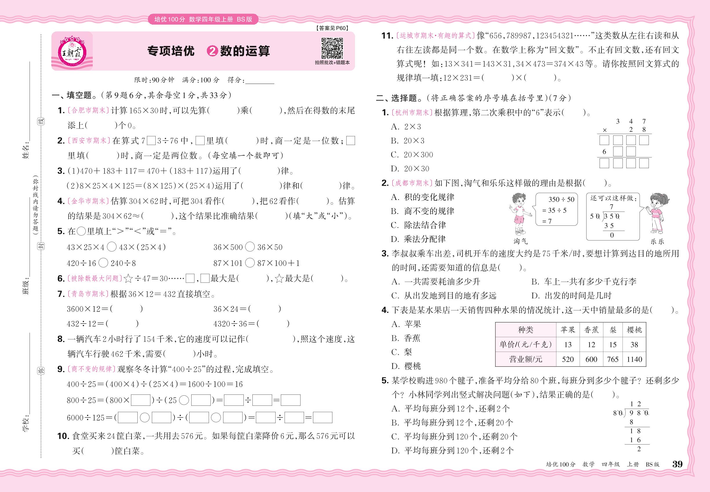 2024秋上册四年级数学北师版 期末专项卷PY版·数的运算【2】