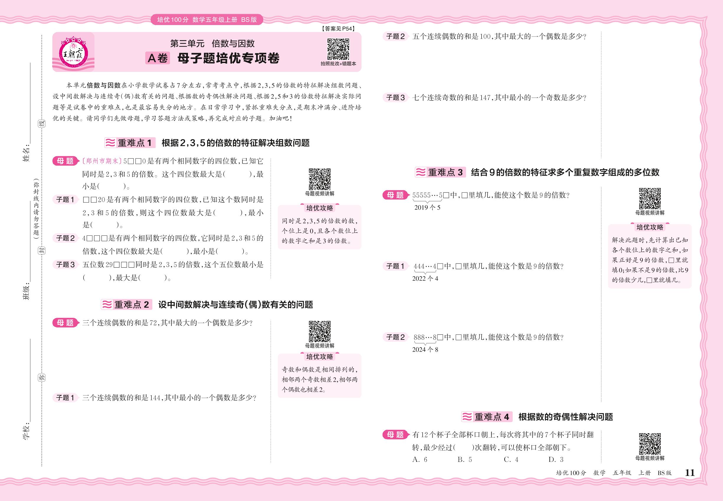 2024秋上册五年级数学北师版 第三单元A卷 母子题培优专项卷