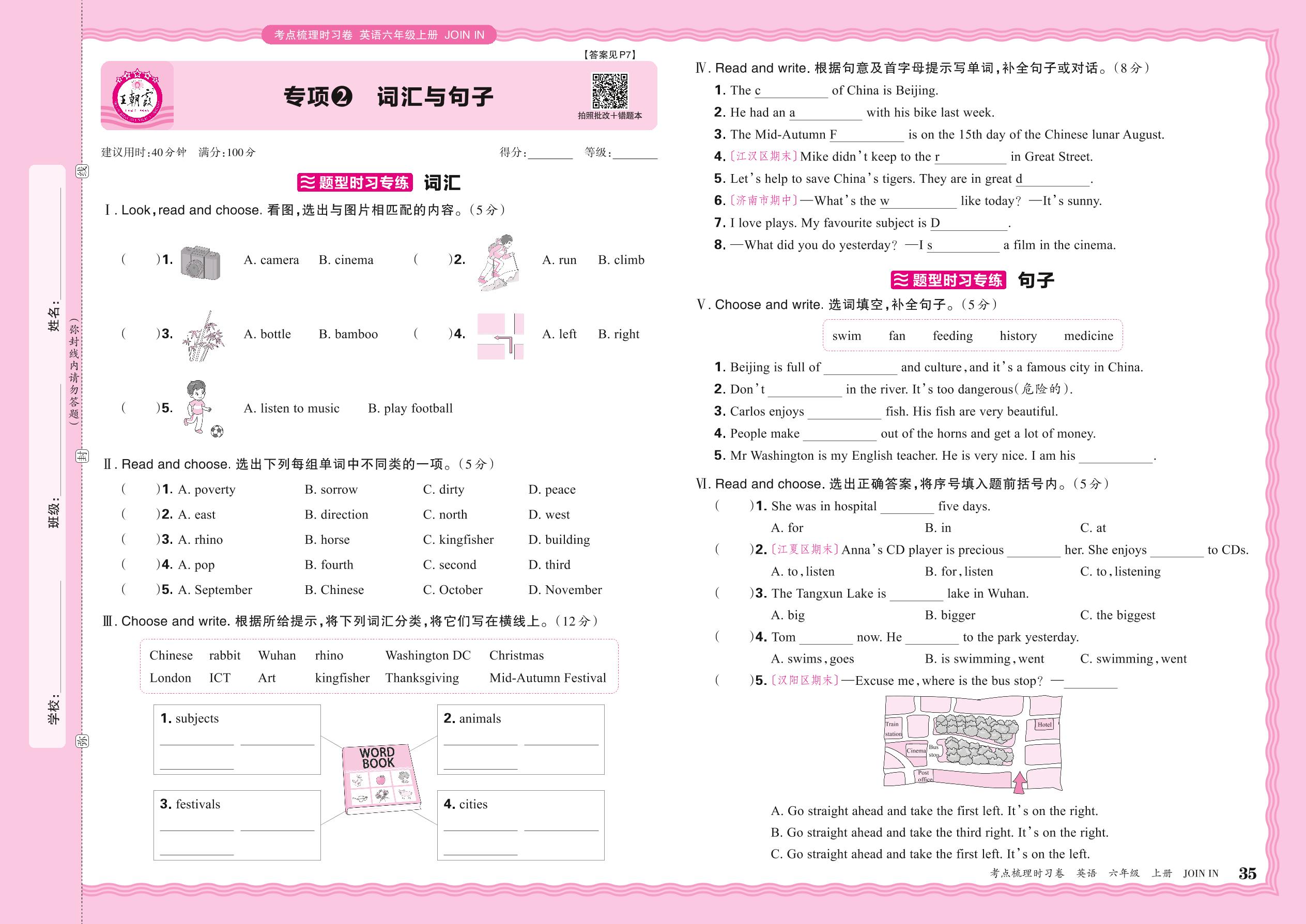 2024秋上册六年级英语剑桥版 期末专项卷PY版·词汇与句子【2】