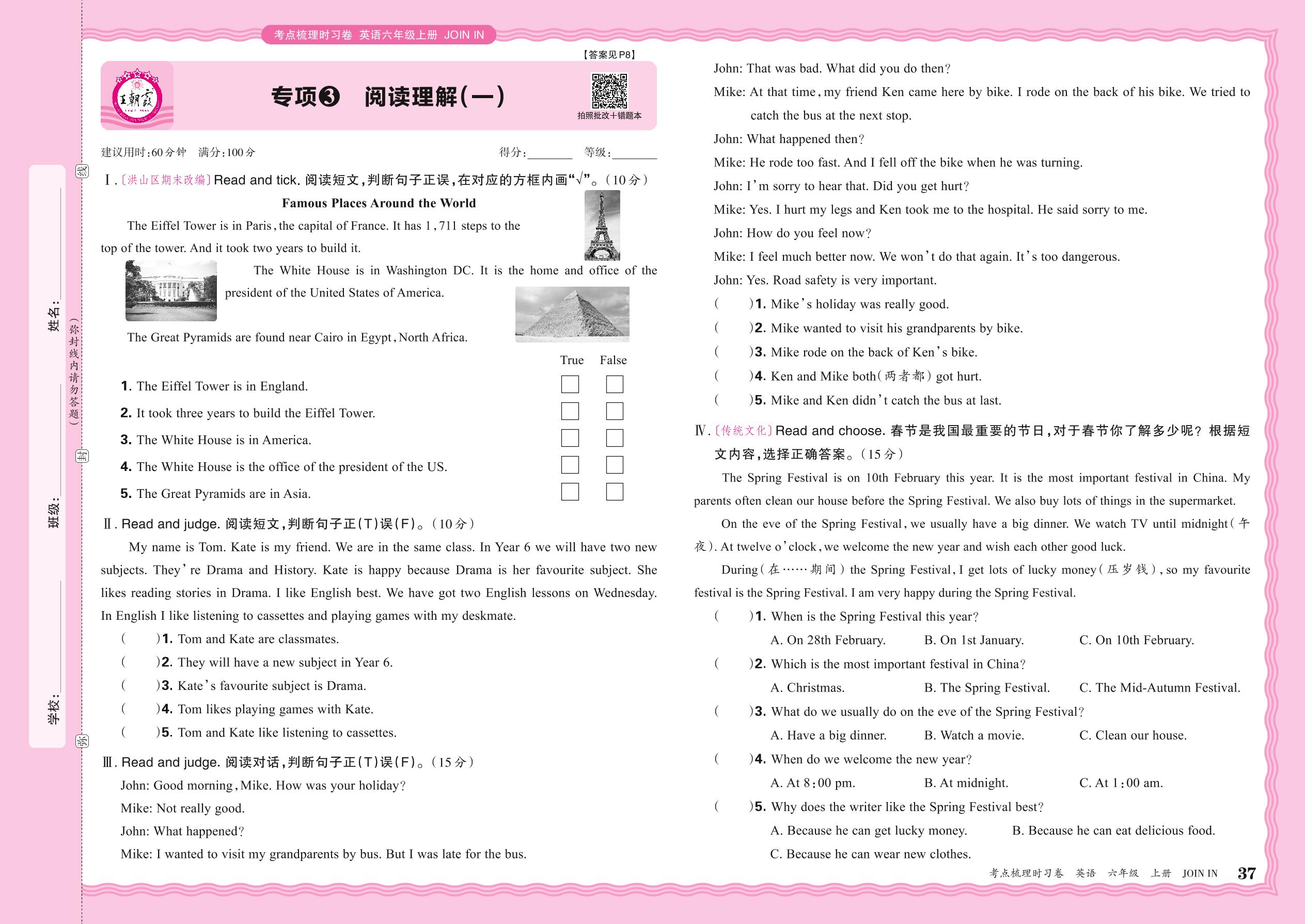 2024秋上册六年级英语剑桥版 期末专项卷PY版·阅读理解(一)【3】
