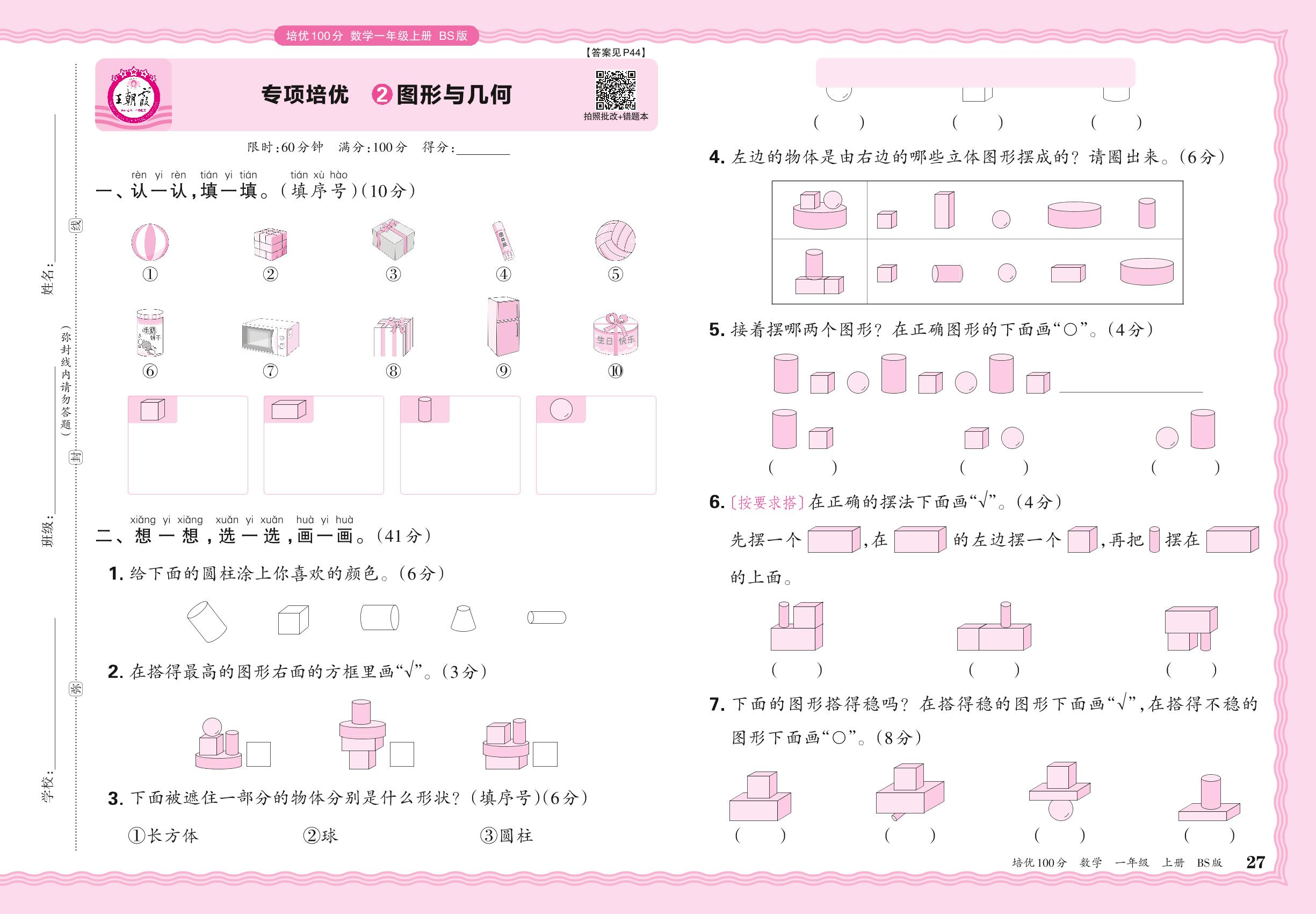 2024秋上册一年级数学北师版 期末专项卷PY版·图形与几何【2】