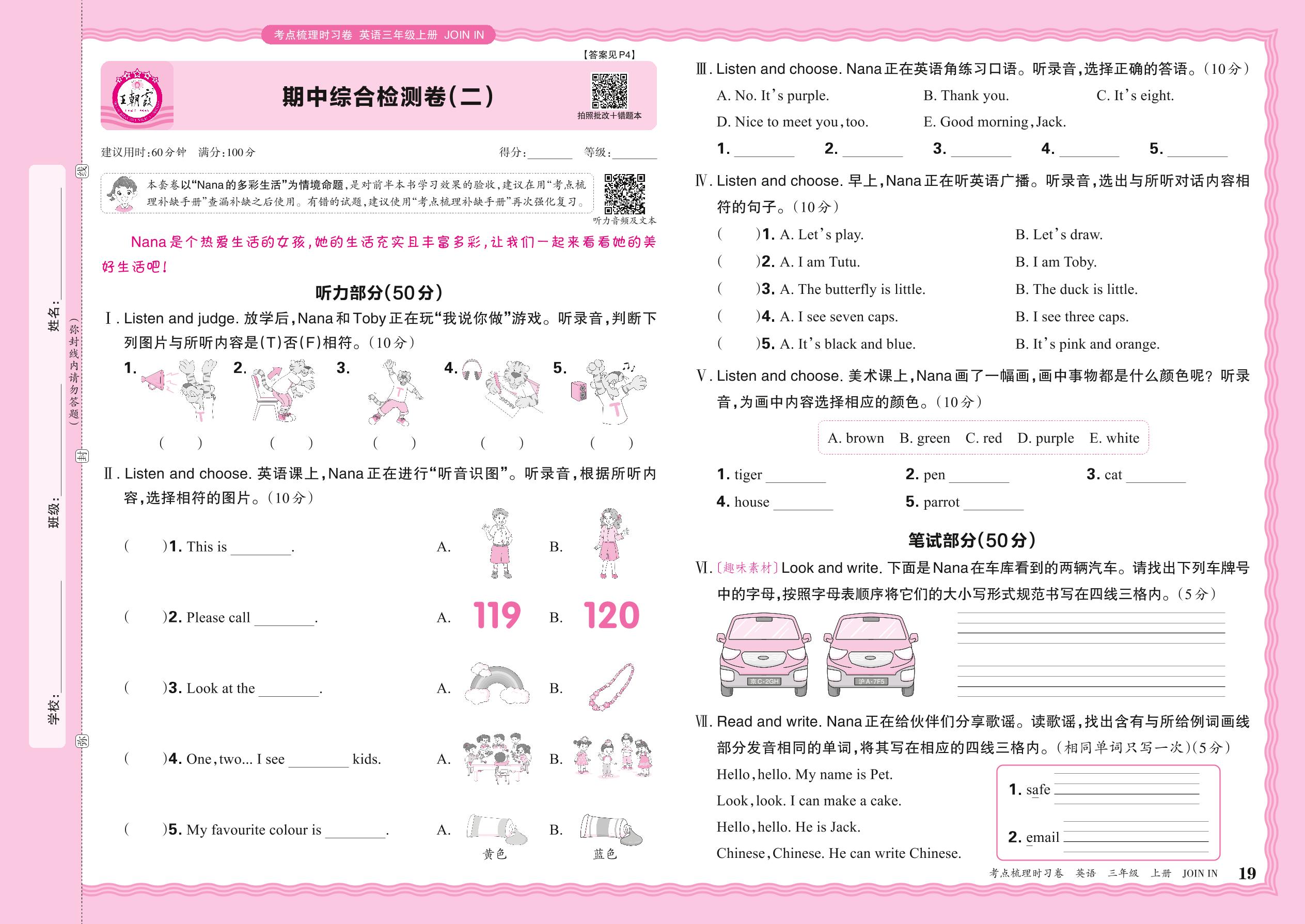 2024秋上册三年级英语剑桥版 期中综合检测卷(二)
