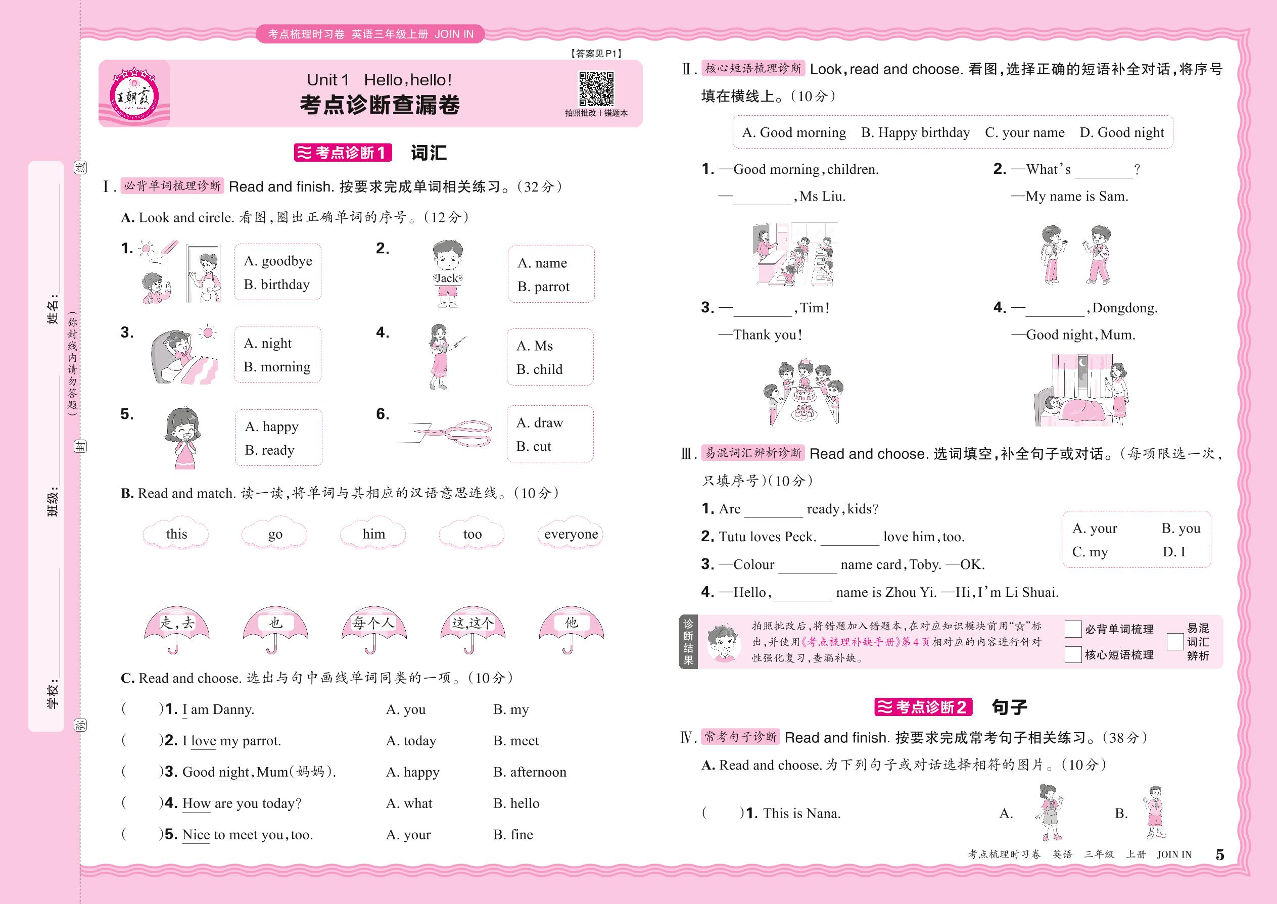2024秋上册三年级英语剑桥版 Unit 1 考点诊断查漏卷