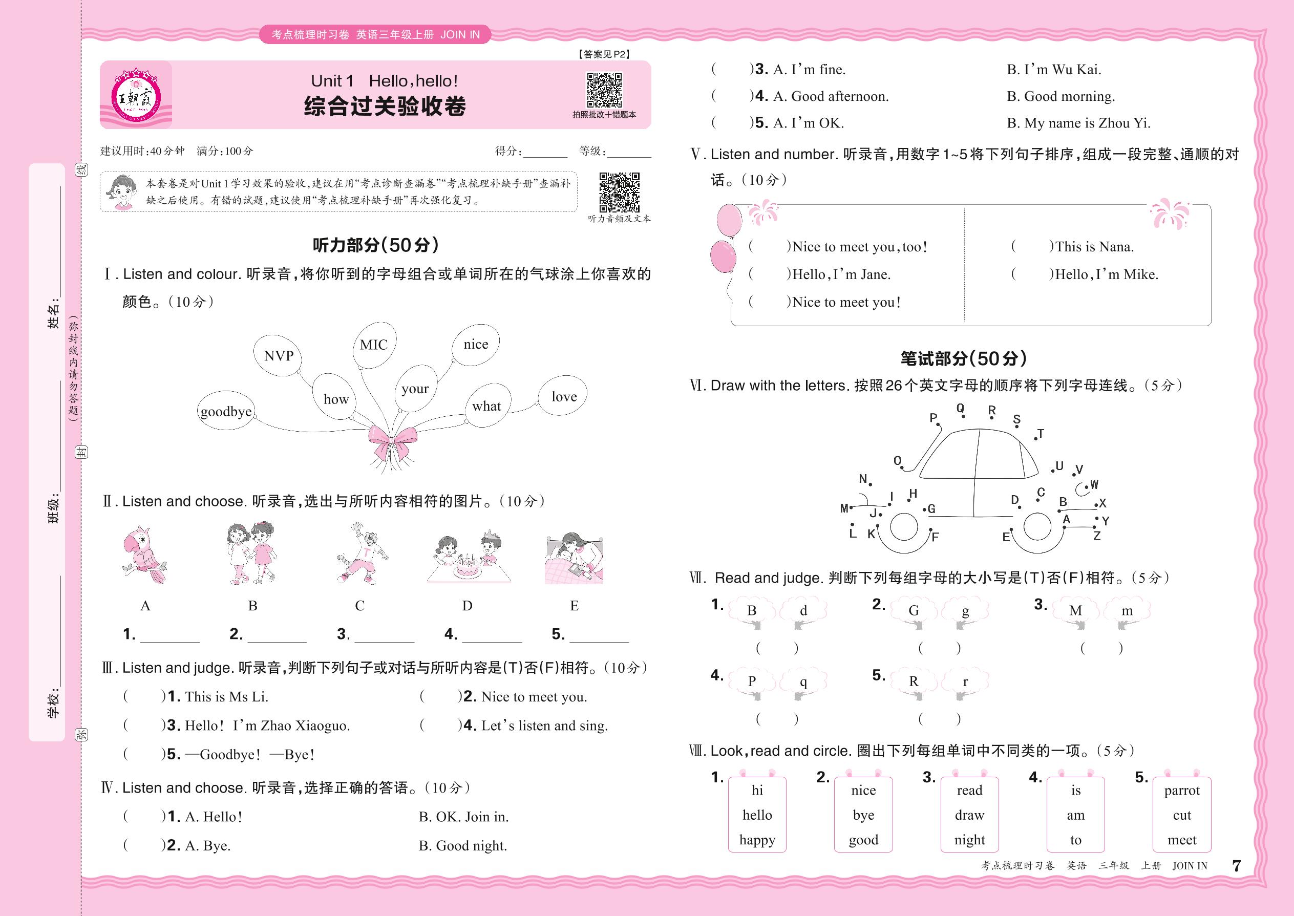 三年级英语剑桥版(2024)上册单元卷
