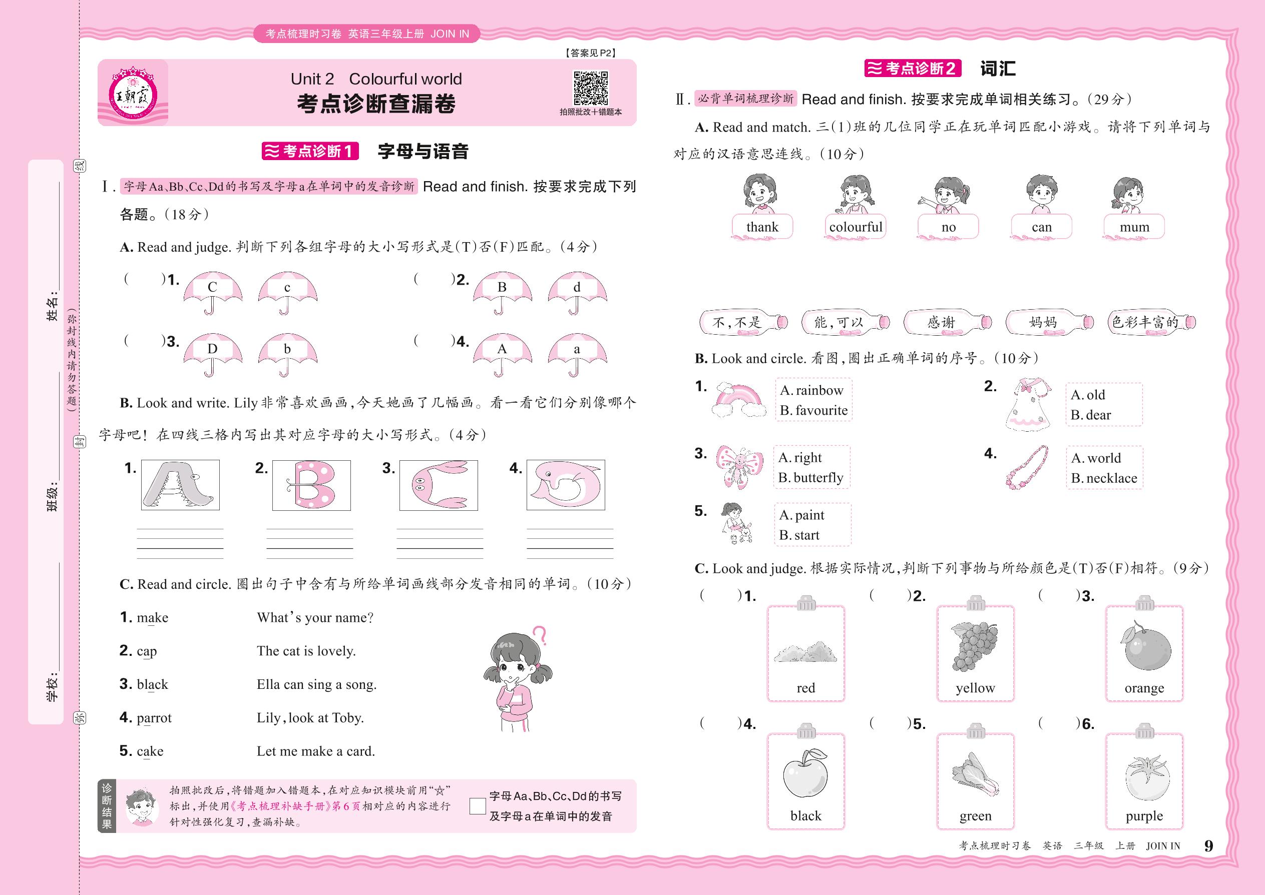 2024秋上册三年级英语剑桥版 Unit 2 考点诊断查漏卷