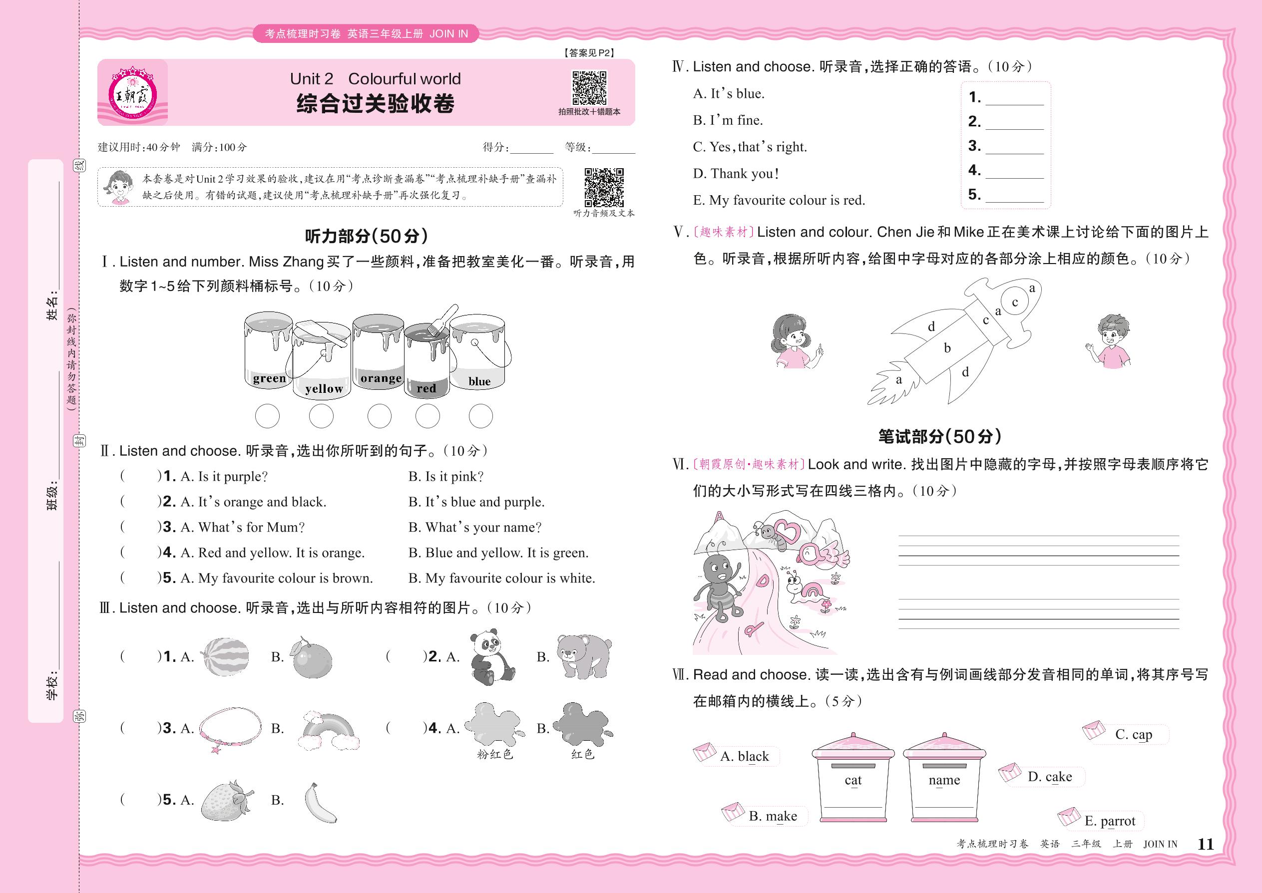 2024秋上册三年级英语剑桥版 Unit 2 综合过关验收卷