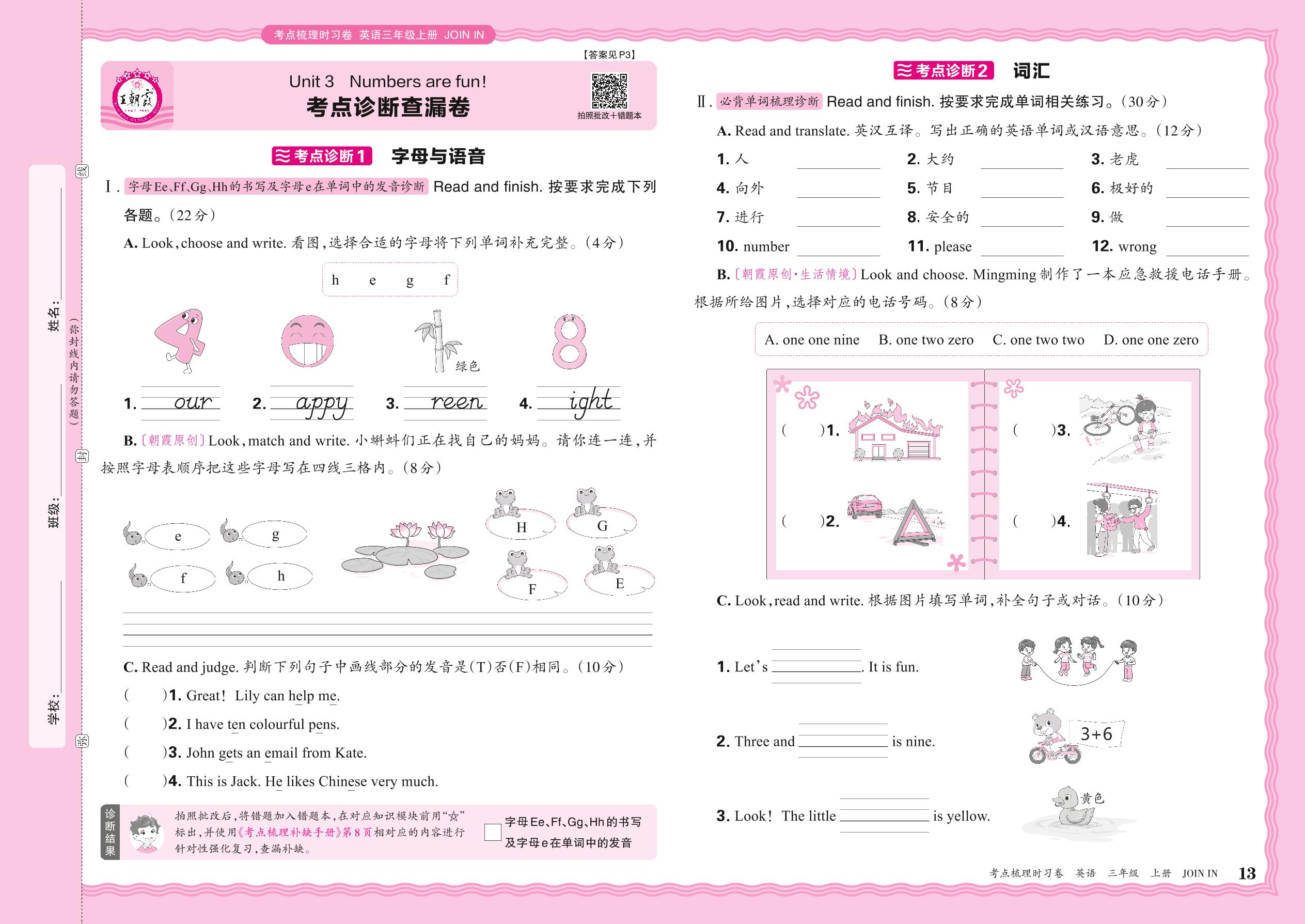 2024秋上册三年级英语剑桥版 Unit 3 考点诊断查漏卷