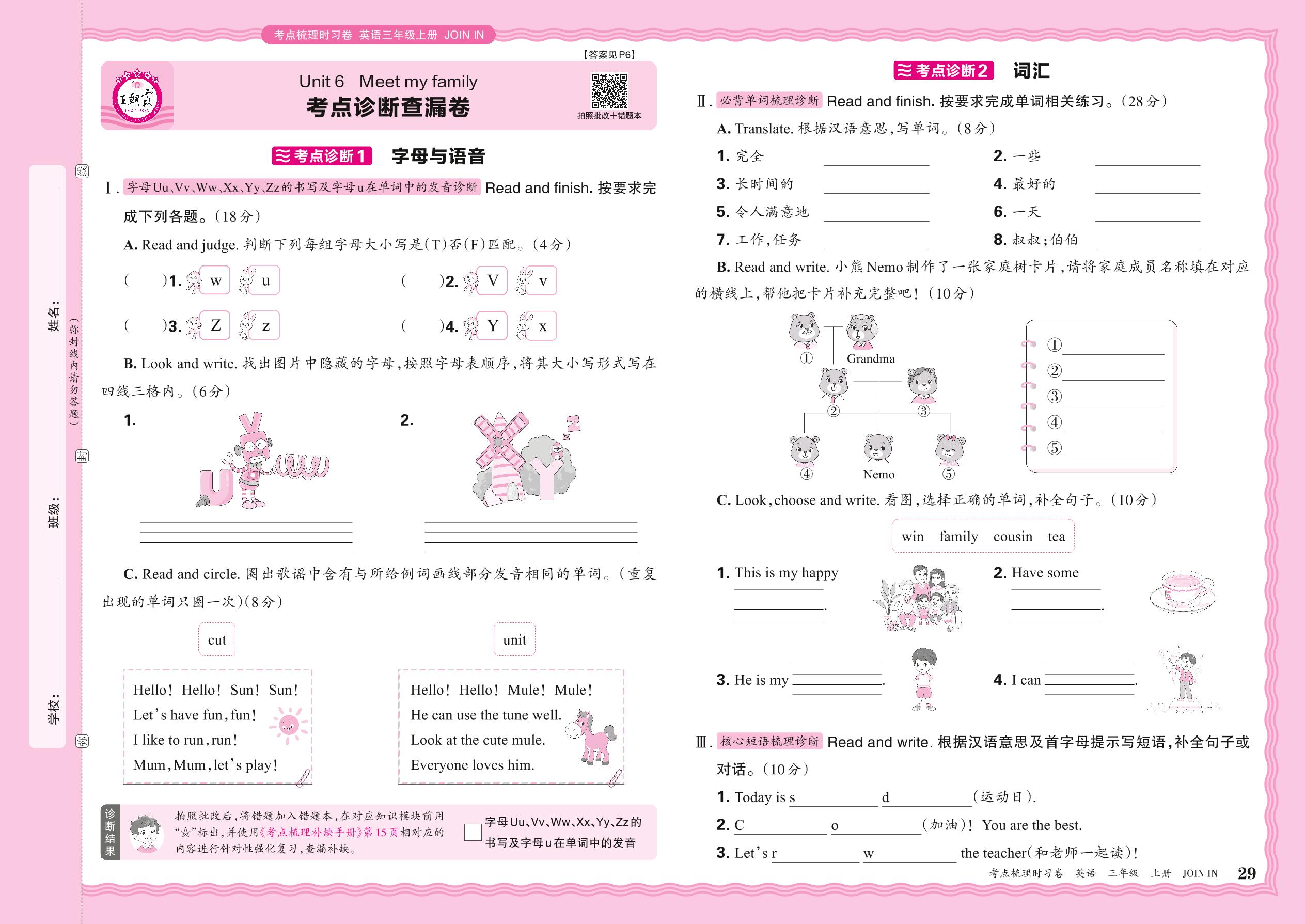 2024秋上册三年级英语剑桥版 Unit 6 考点诊断查漏卷