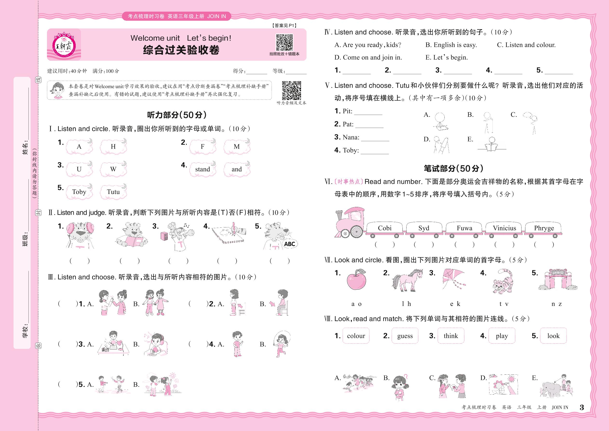 2024秋上册三年级英语剑桥版 Welcome unit 综合过关验收卷