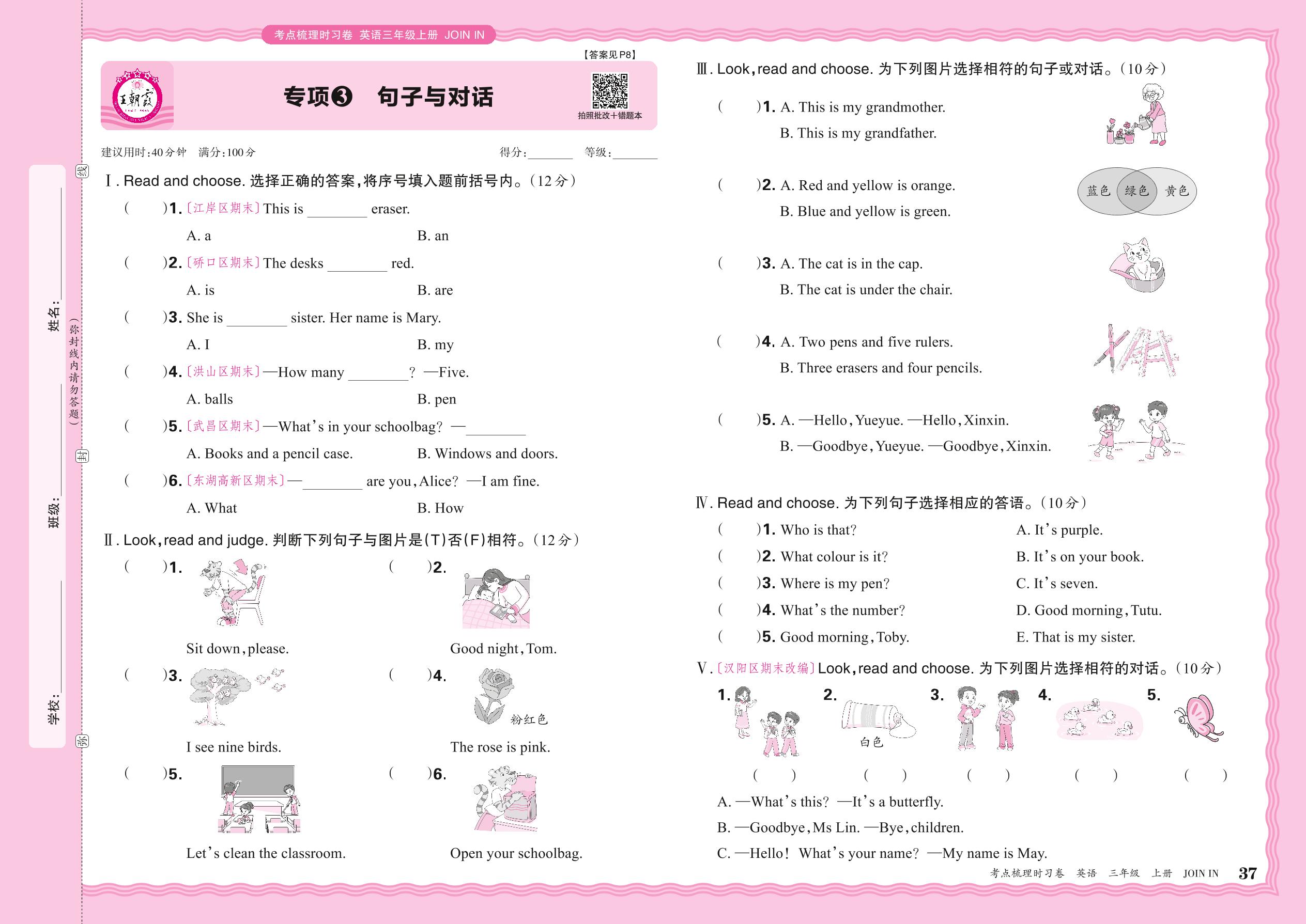 2024秋上册三年级英语剑桥版 期末专项卷PY版·句子与对话【3】