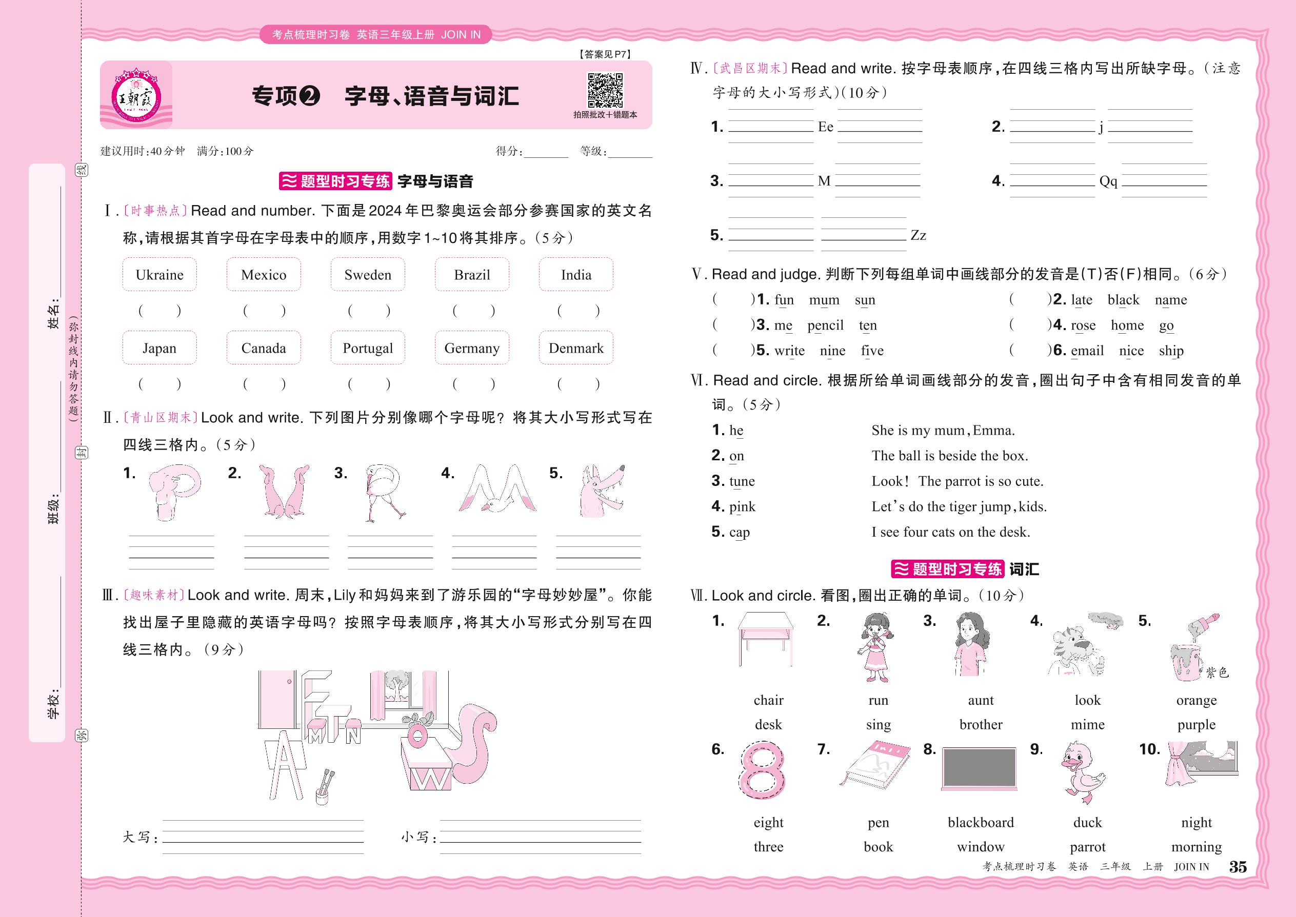 2024秋上册三年级英语剑桥版 期末专项卷PY版·字母、语音与词汇【2】
