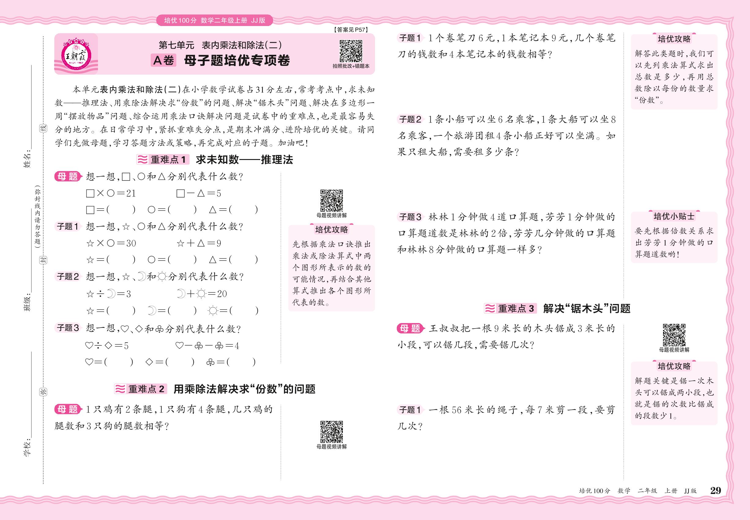 2024秋上册二年级数学冀教版 第七单元A卷 母子题培优专项卷