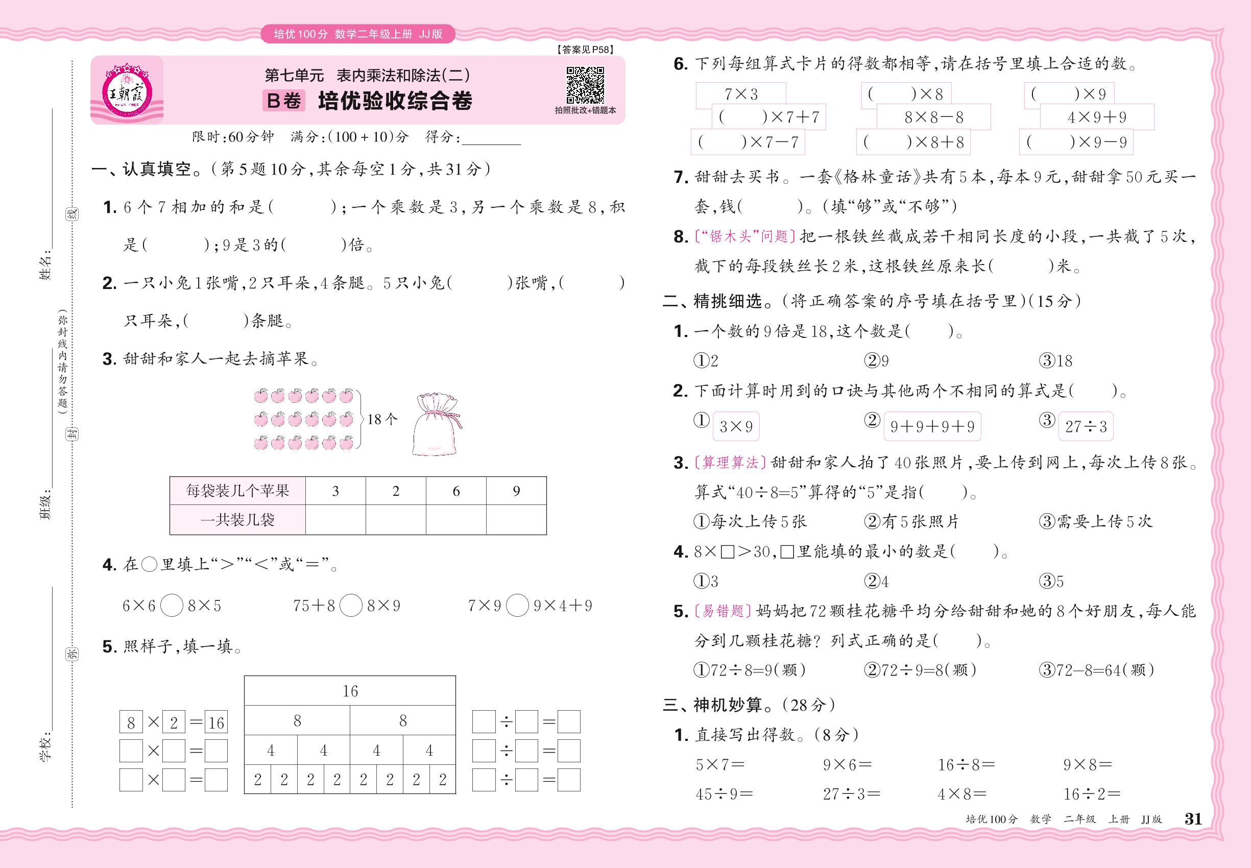 2024秋上册二年级数学冀教版 第七单元B卷 培优验收综合卷