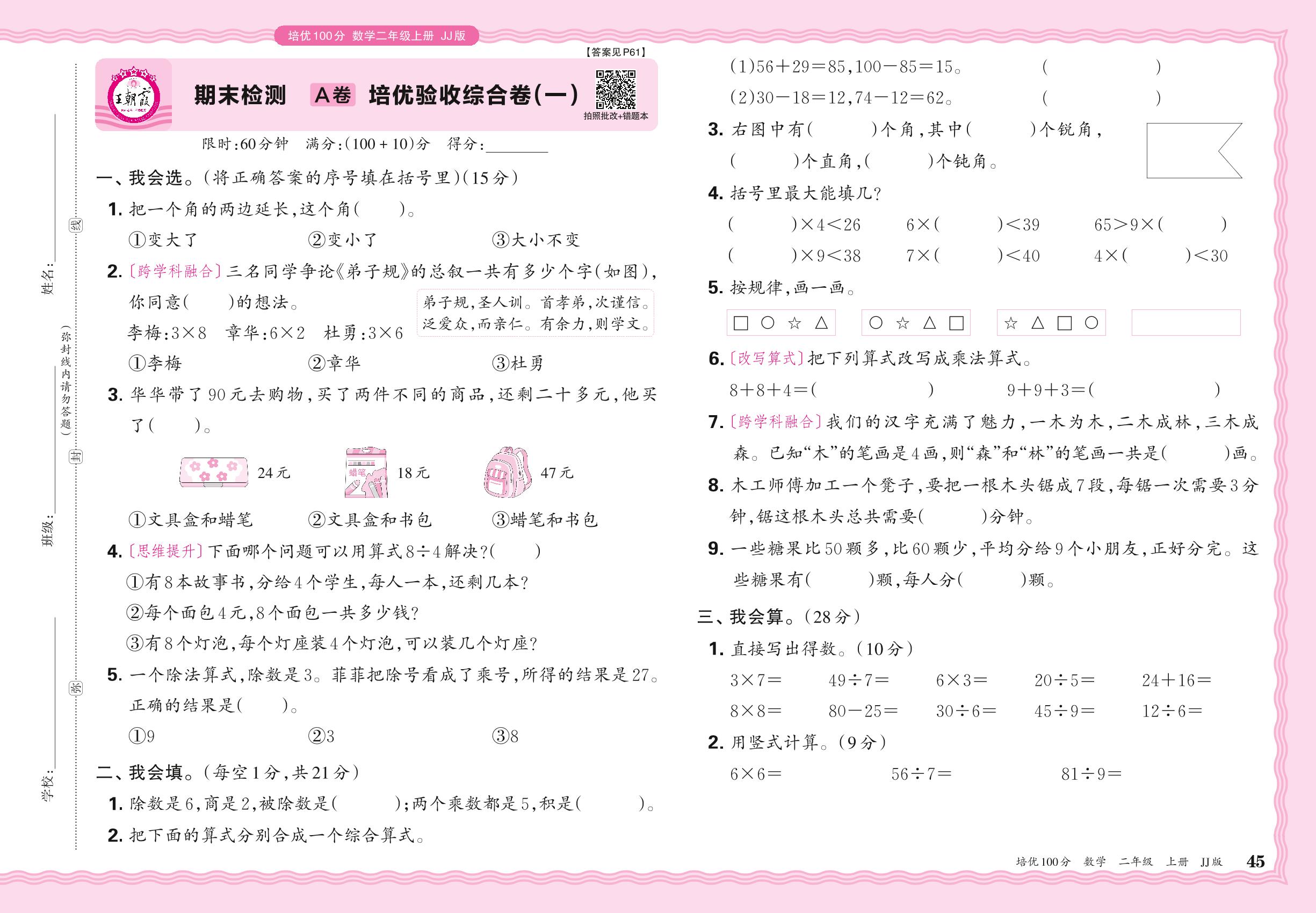 2024秋上册二年级数学冀教版 期末检测A卷 培优验收综合卷(一)
