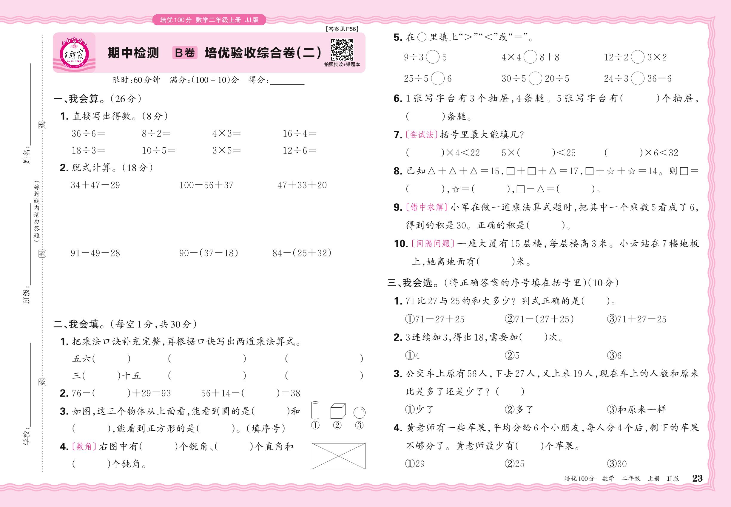 2024秋上册二年级数学冀教版 期中检测B卷 培优验收综合卷(二)