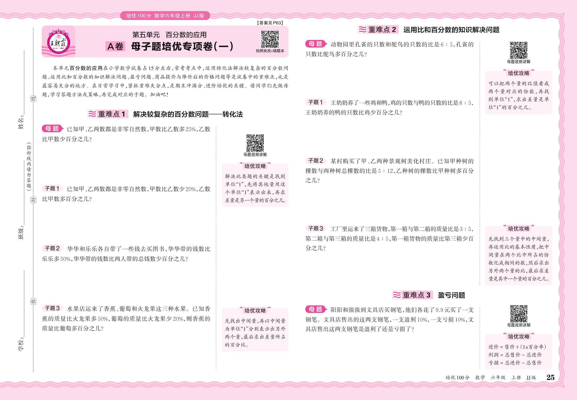 2024秋上册六年级数学冀教版 第五单元A卷 母子题培优专项卷(一)