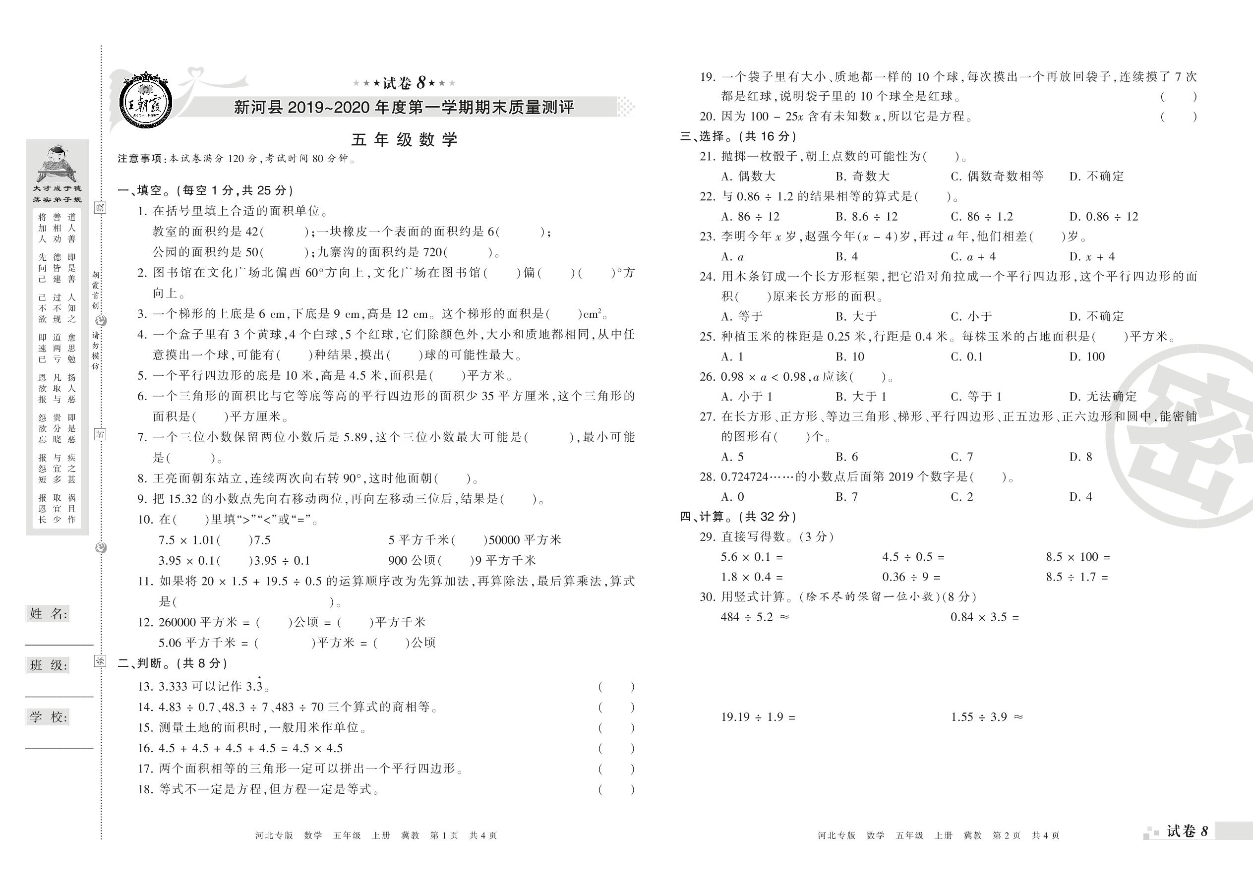2019-2020学年第一学期邢台市新河县五年级数学试卷(冀教版)【8】