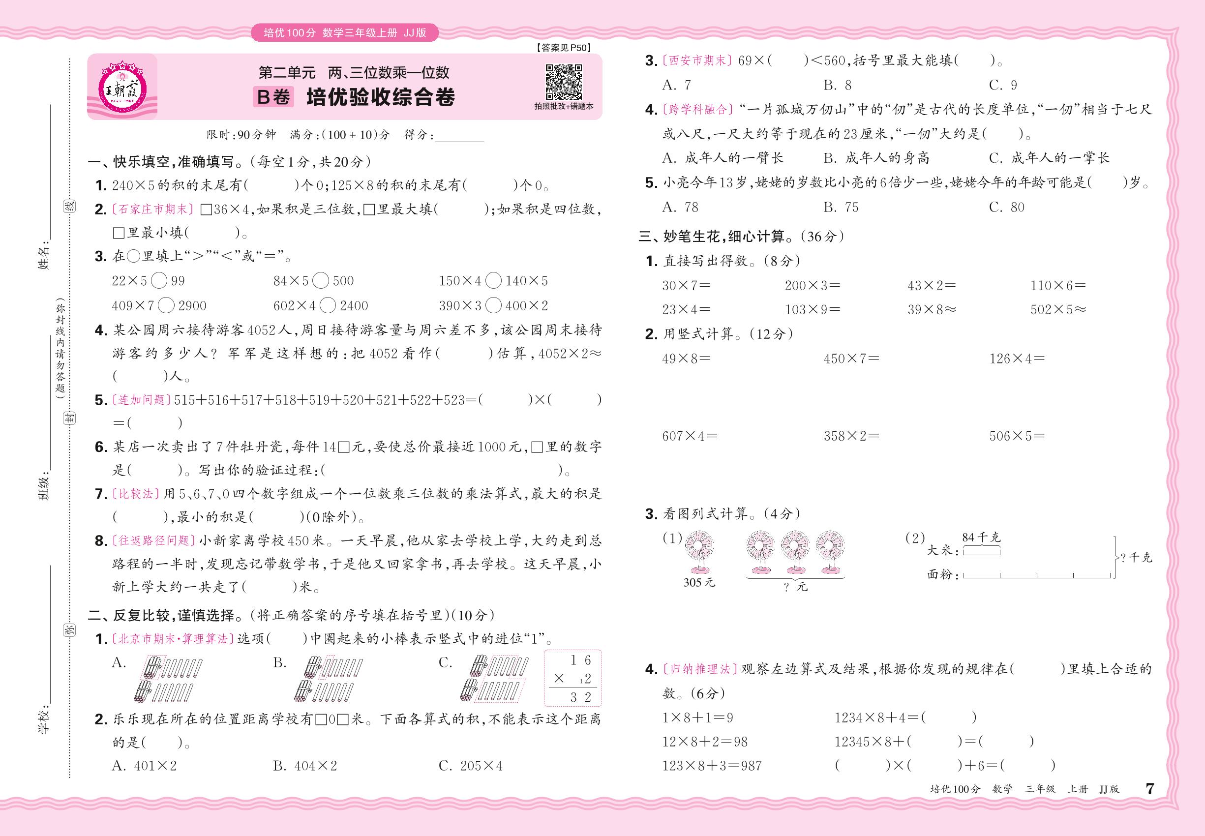 2024秋上册三年级数学冀教版 第二单元B卷 培优验收综合卷