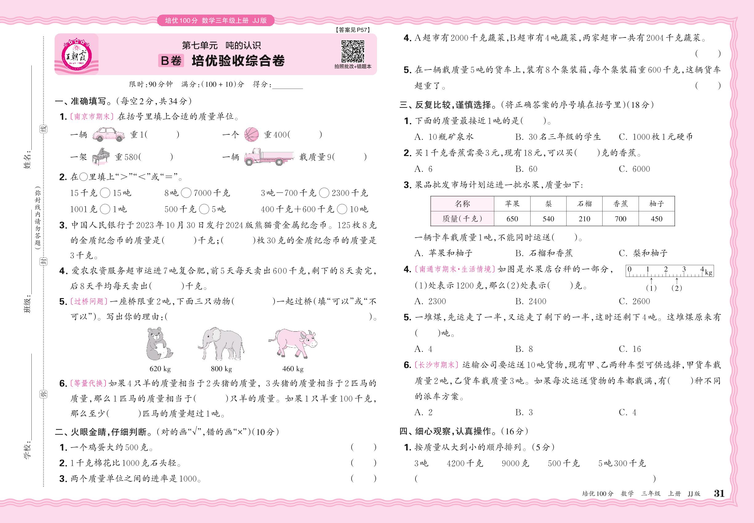 2024秋上册三年级数学冀教版 第七单元B卷 培优验收综合卷