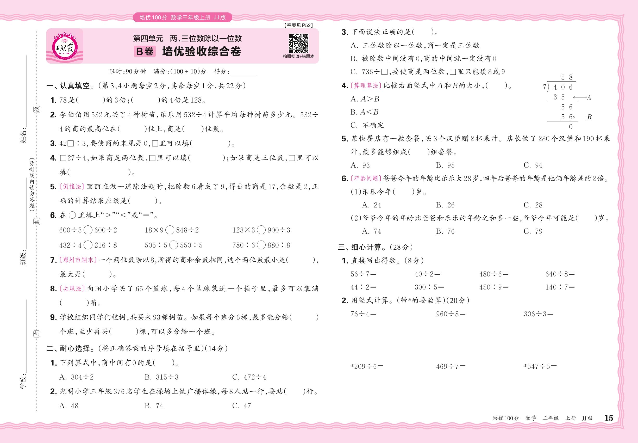2024秋上册三年级数学冀教版 第四单元B卷 培优验收综合卷