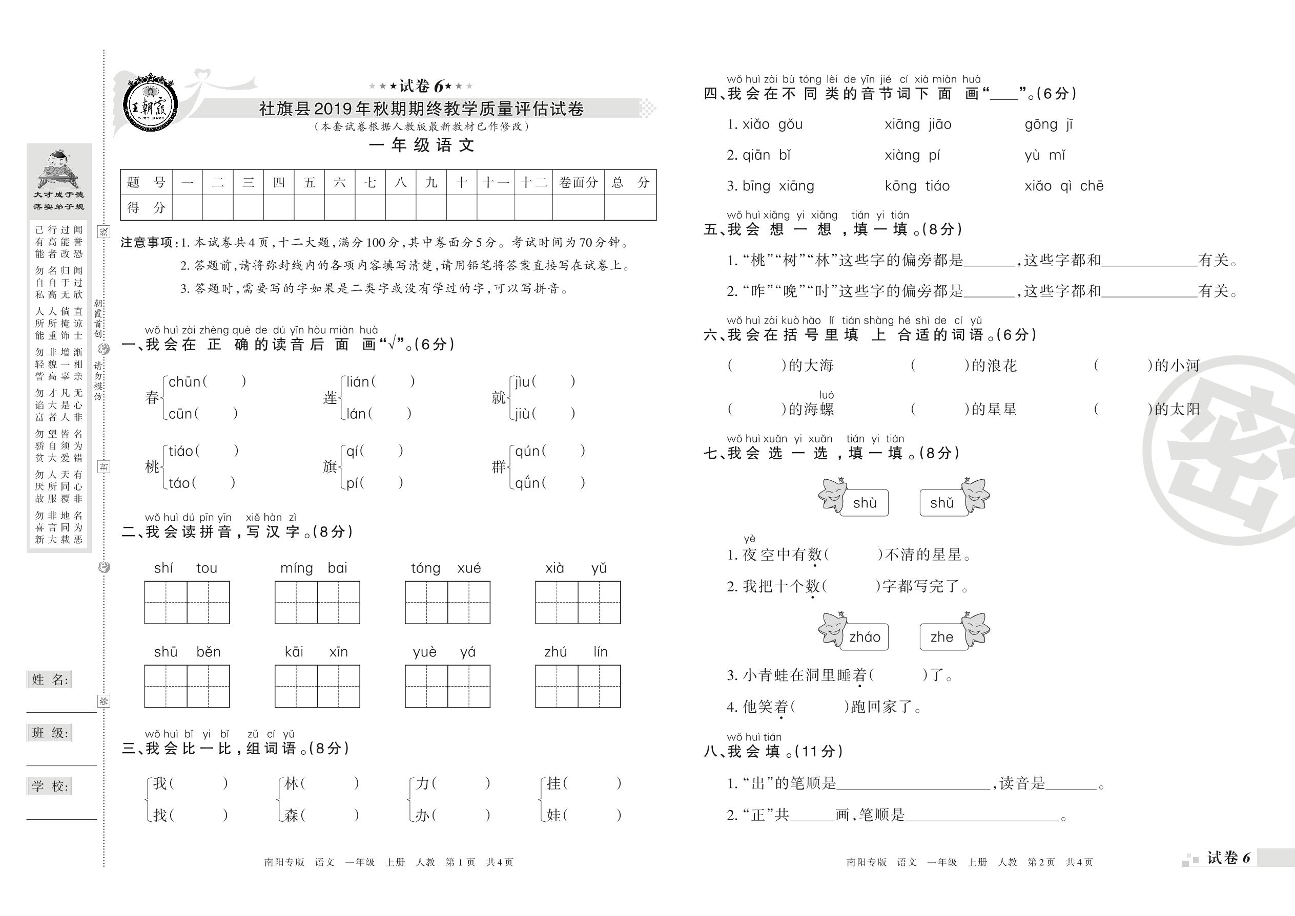 2019-2020学年第一学期南阳市社旗县一年级语文试卷(人教版)【6】