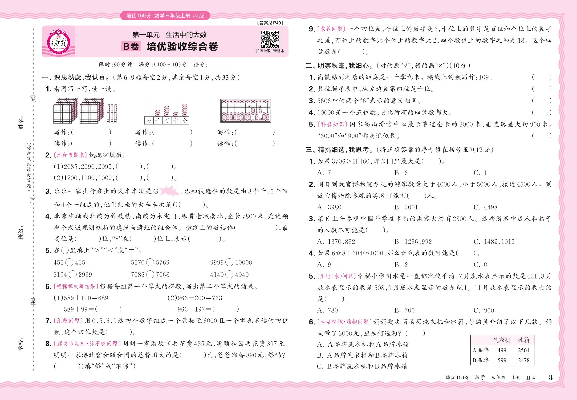 2024秋上册三年级数学冀教版 第一单元B卷 培优验收综合卷