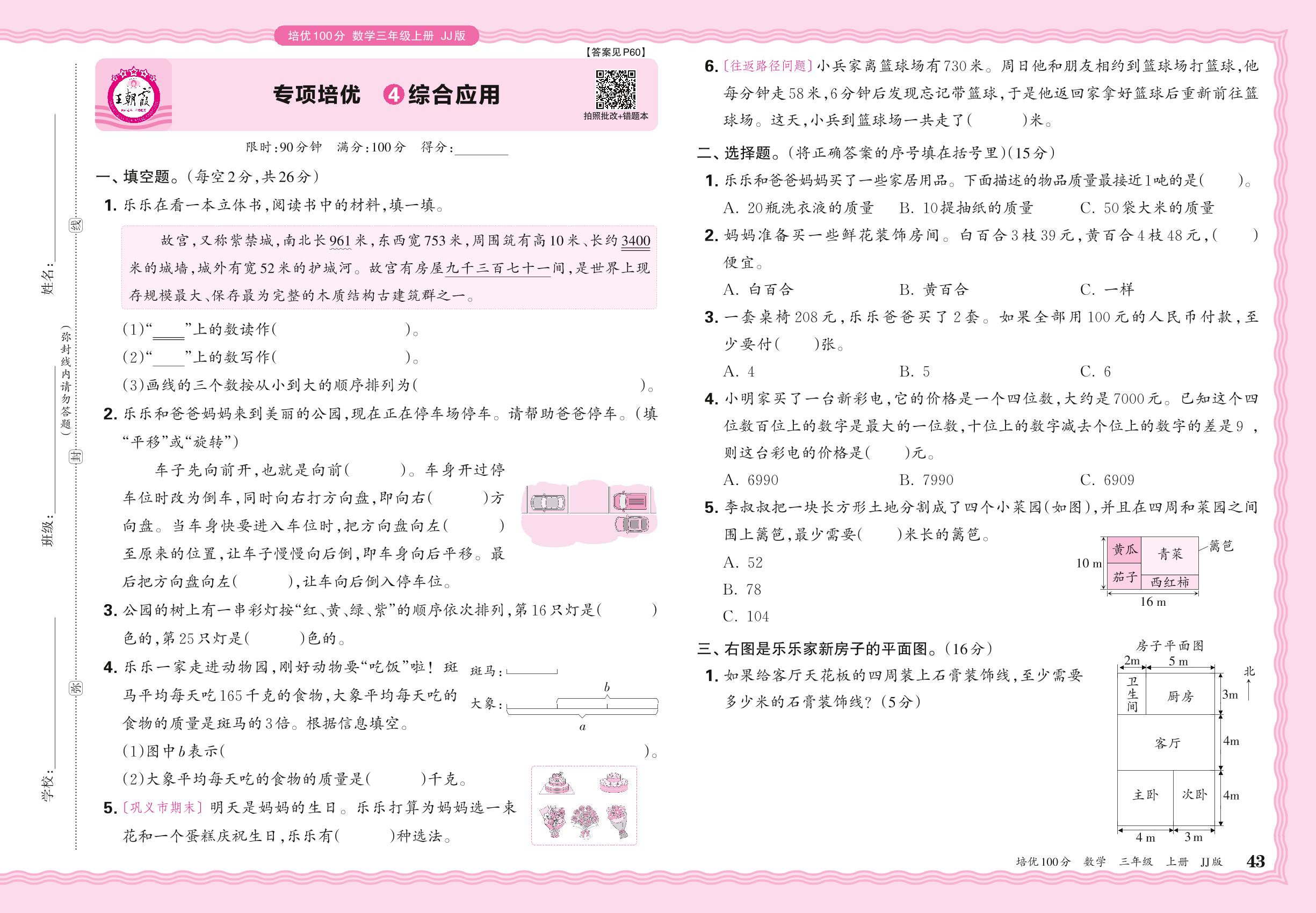 2024秋上册三年级数学冀教版 期末专项卷PY版·综合应用【4】