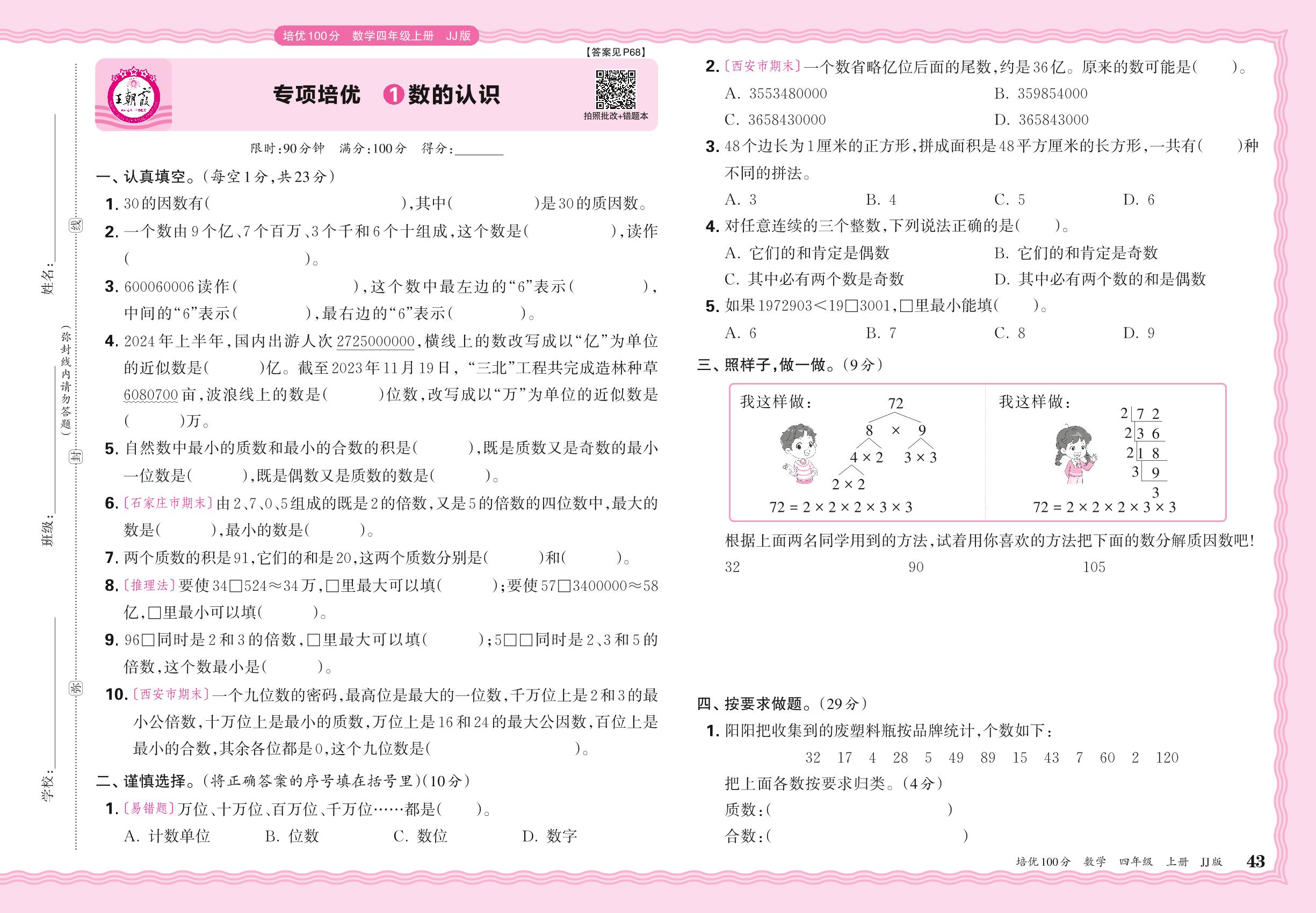 2024秋上册四年级数学冀教版 期末专项卷PY版·数的认识【1】
