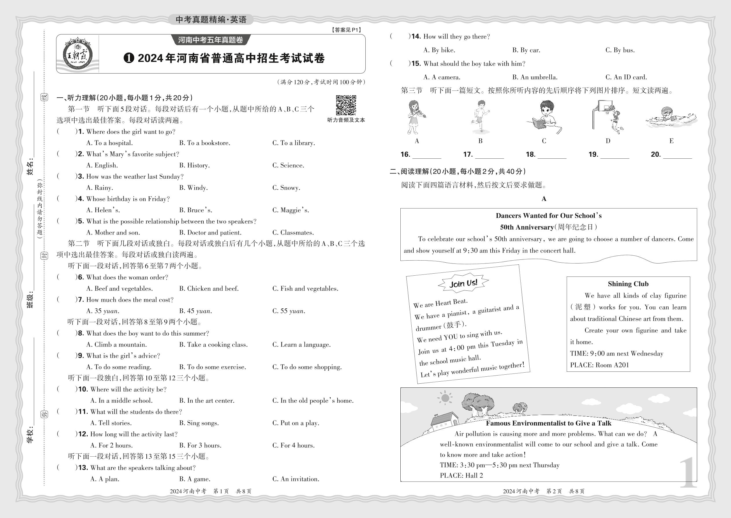 中考英语·2024年河南省普通高中招生考试试卷【1】