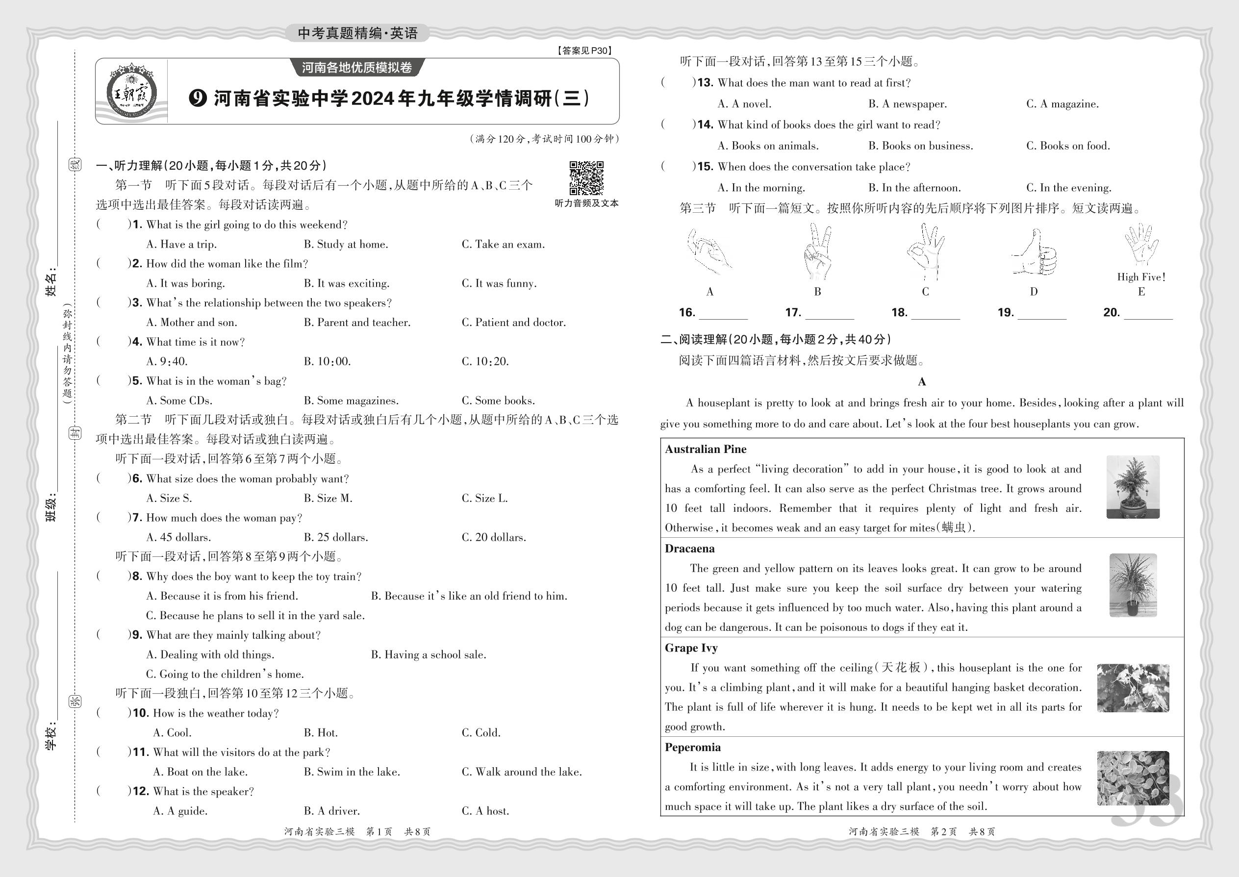 中考英语·河南省实验中学2024年九年级学情调研(三)【9】