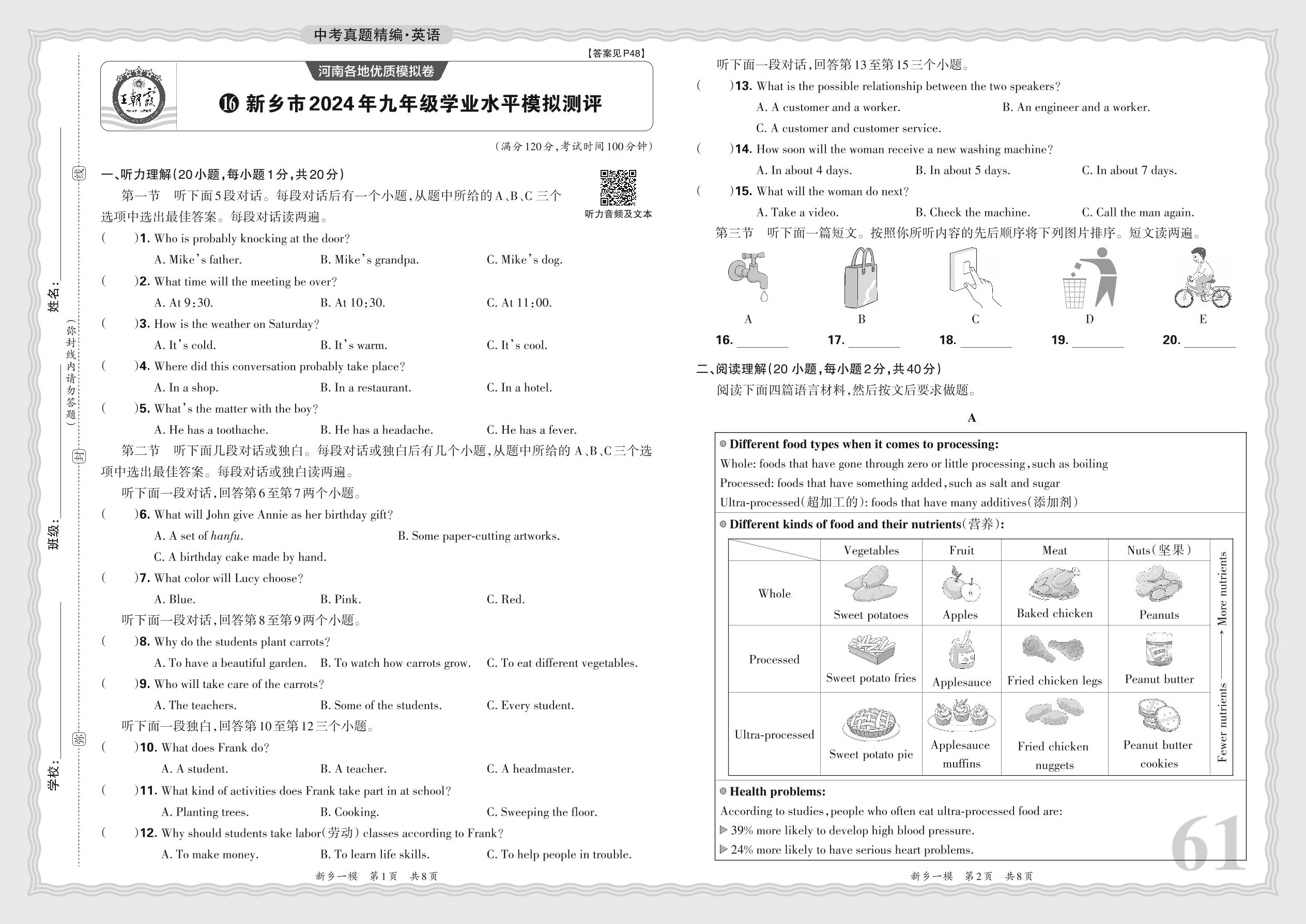 中考英语·河南省新乡市2024年九年级学业水平模拟测评【16】