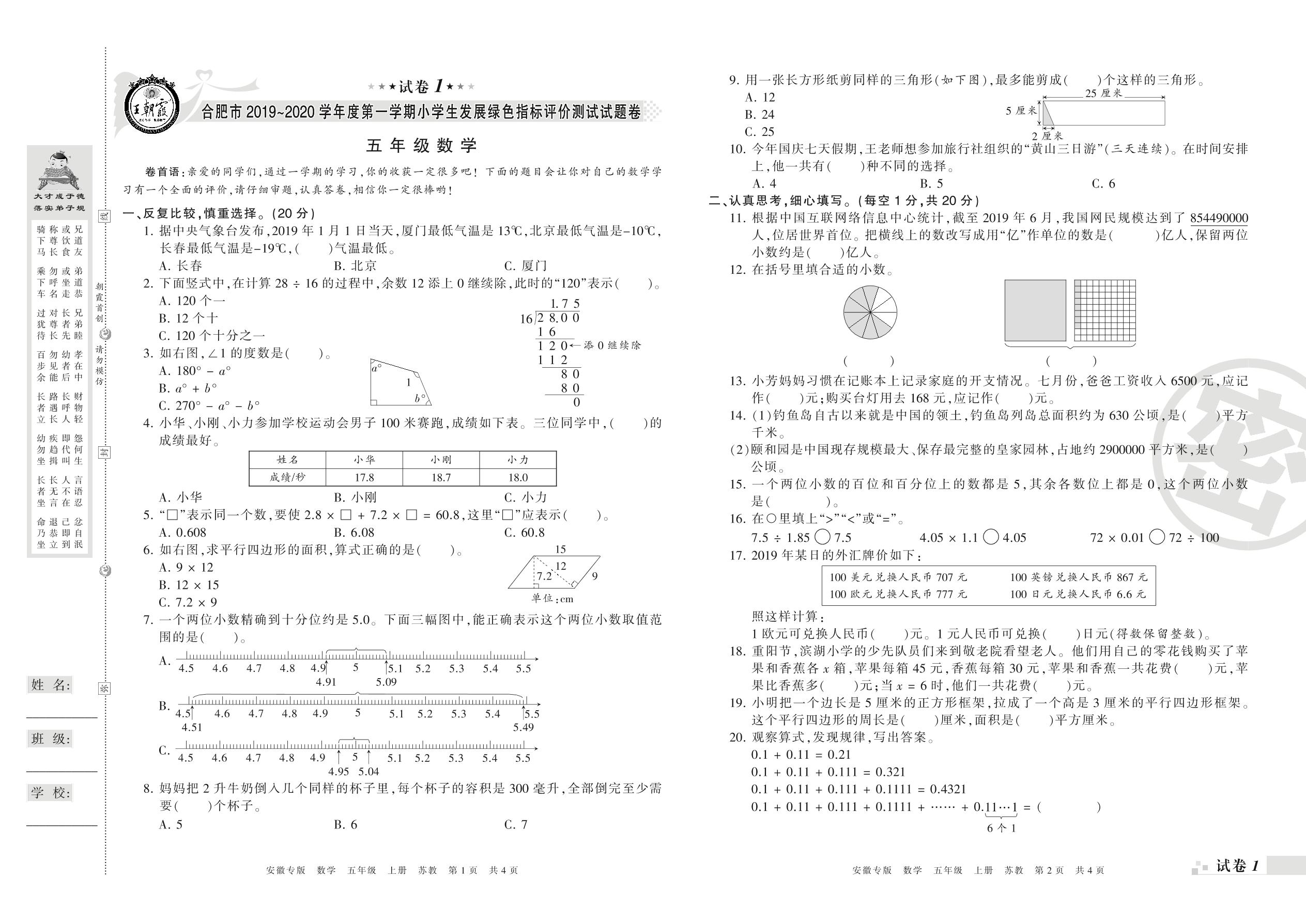2019-2020学年第一学期合肥市五年级数学试卷(苏教版)【1】