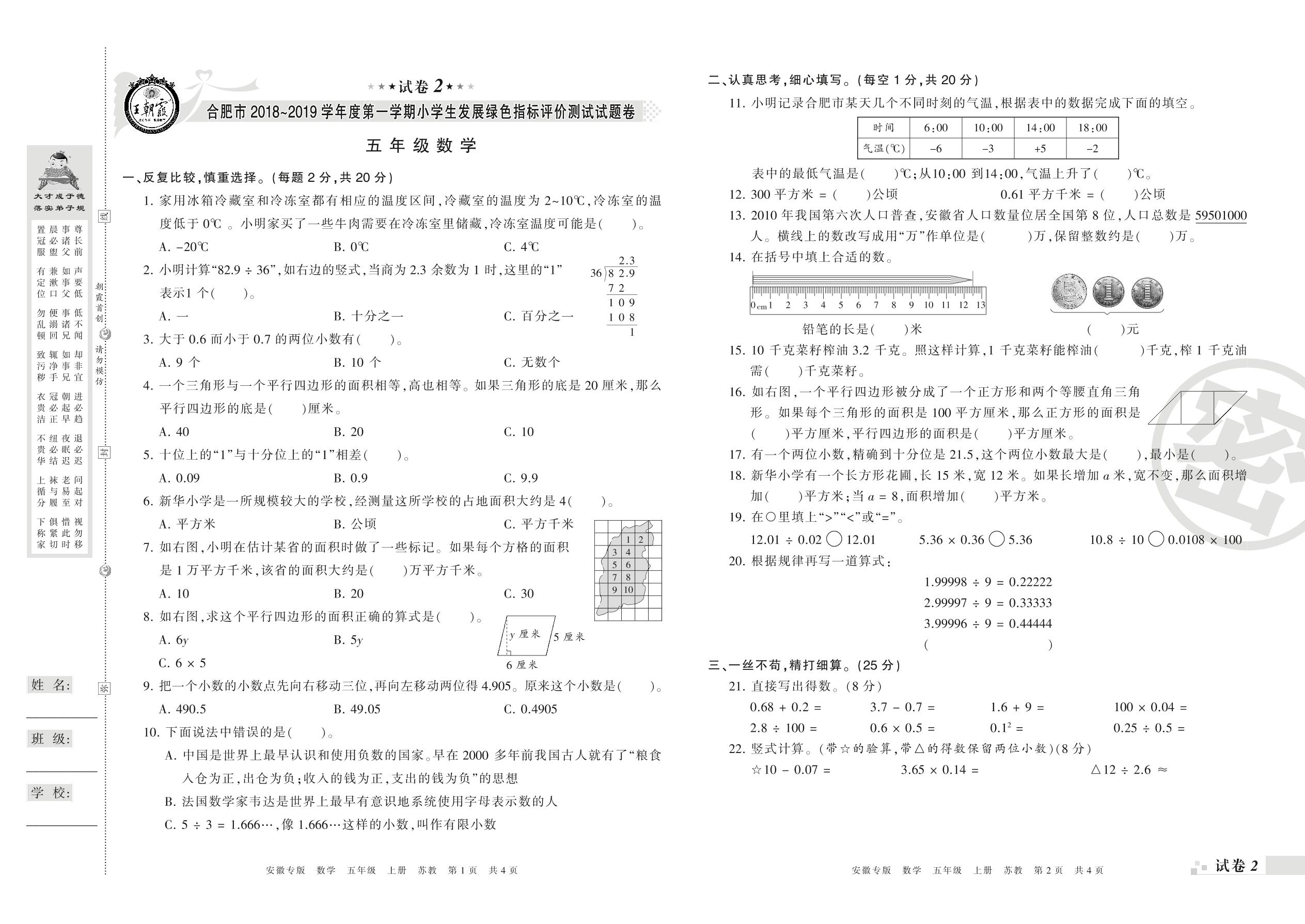 2018-2019学年第一学期合肥市五年级数学试卷(苏教版)【2】