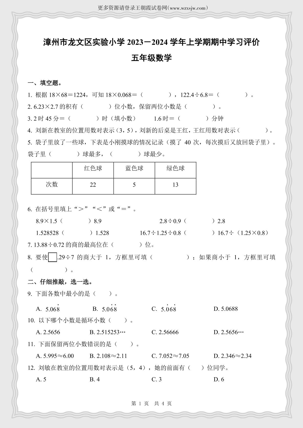 福建省漳州市龙文区实验小学2023-2024学年第一学期期中学习评价五年级数学(人教版)