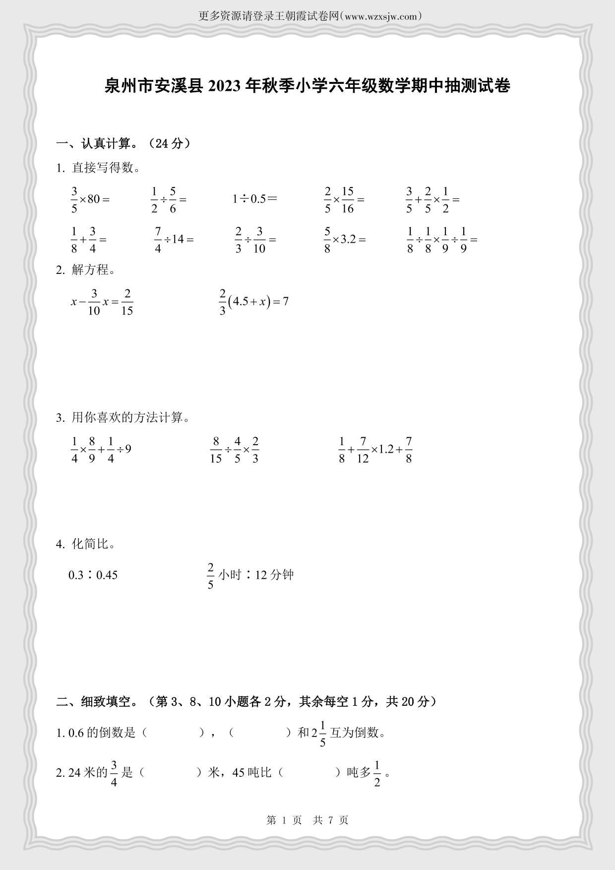 福建省泉州市安溪县2023-2024学年第一学期期中抽测试卷六年级数学(人教版)