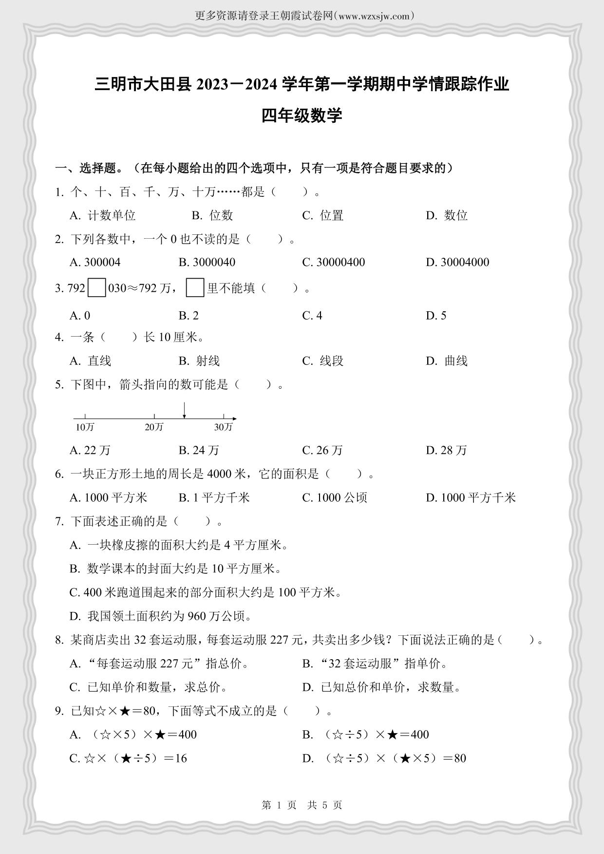 福建省三明市大田县2023-2024学年第一学期期中学情跟踪作业四年级数学(人教版)