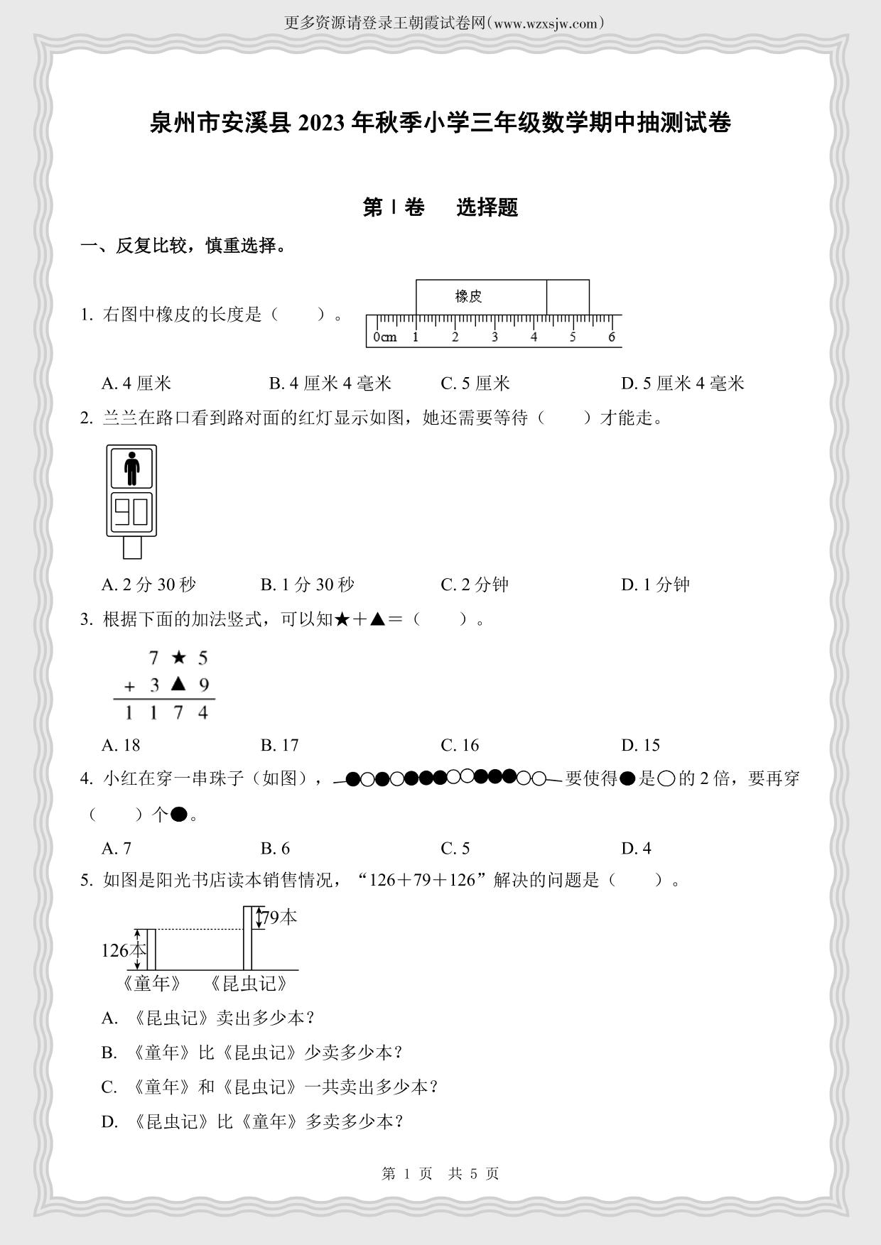 福建省泉州市安溪县2023-2024学年第一学期期中抽测试卷三年级数学(人教版)