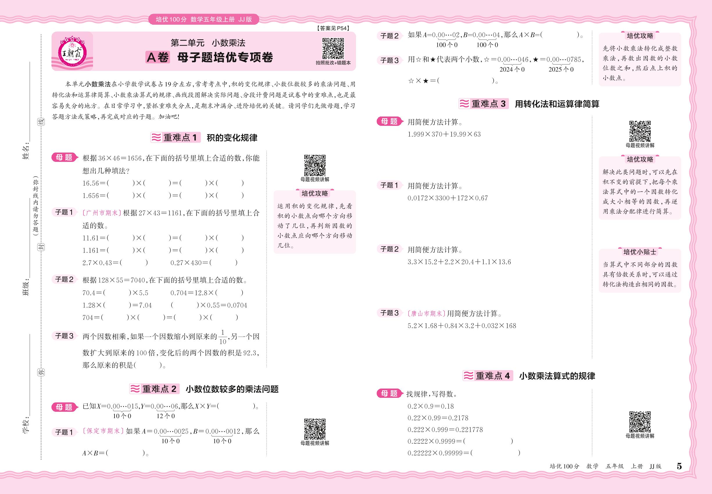 2024秋上册五年级数学冀教版 第二单元A卷 母子题培优专项卷