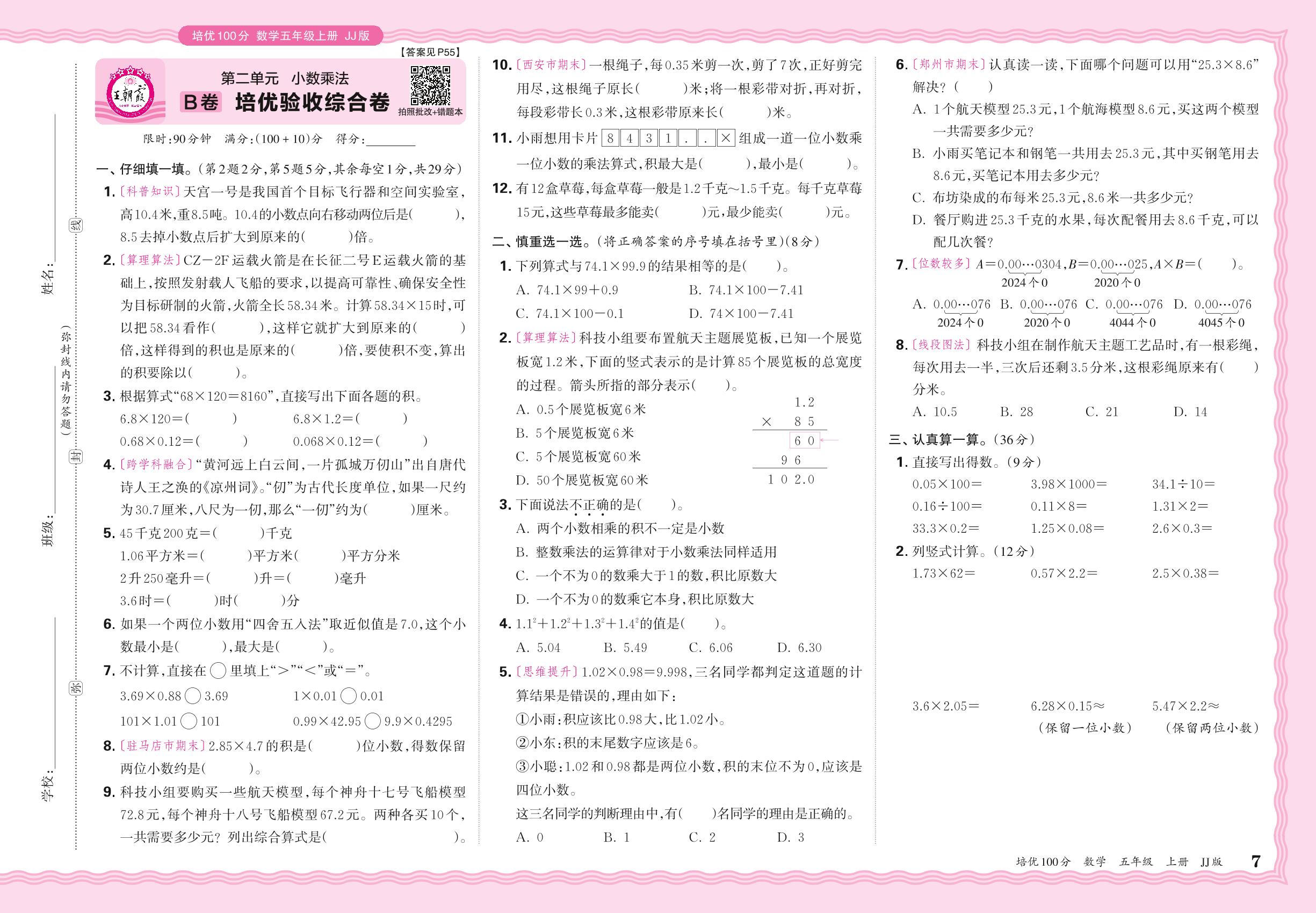 2024秋上册五年级数学冀教版 第二单元B卷 培优验收综合卷