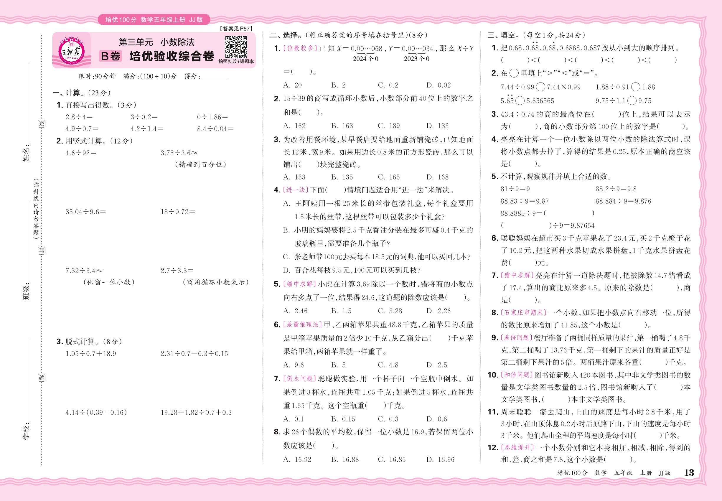 2024秋上册五年级数学冀教版 第三单元B卷 培优验收综合卷