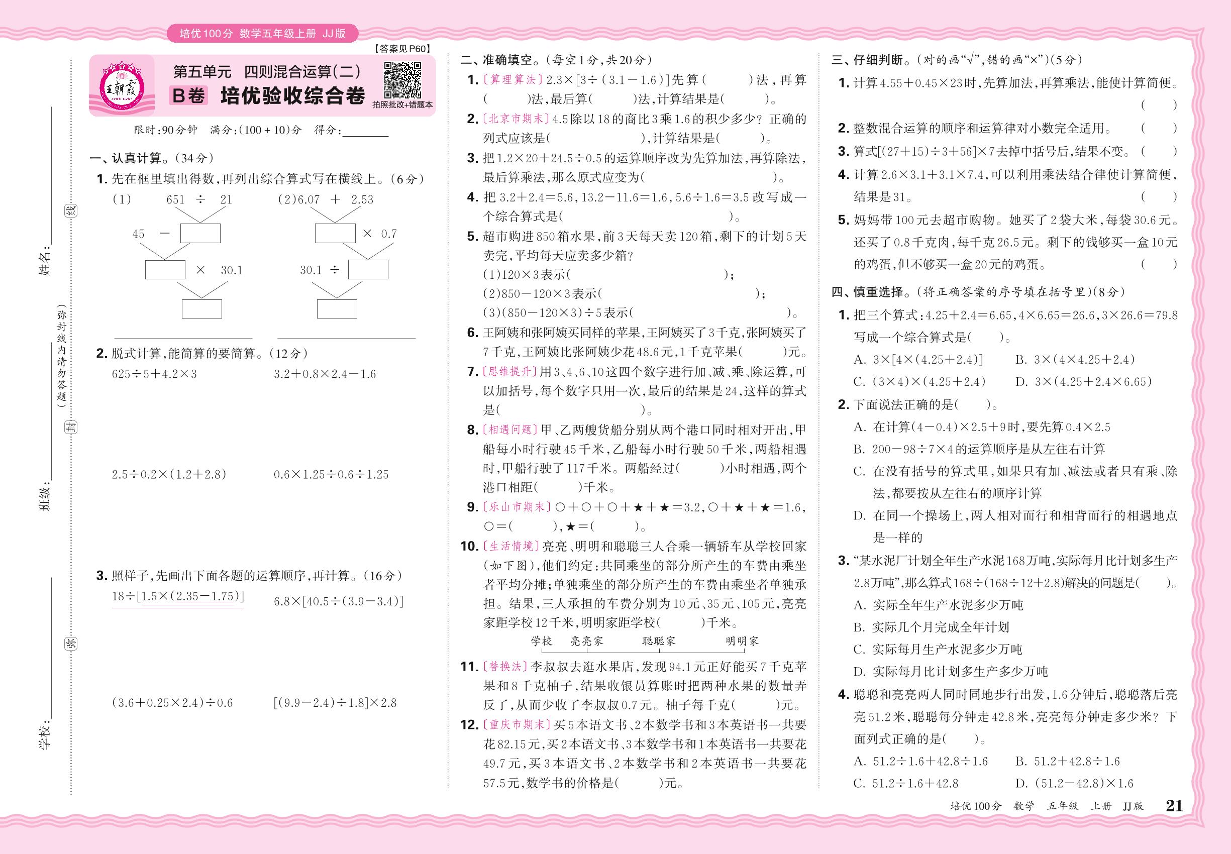 2024秋上册五年级数学冀教版 第五单元B卷 培优验收综合卷