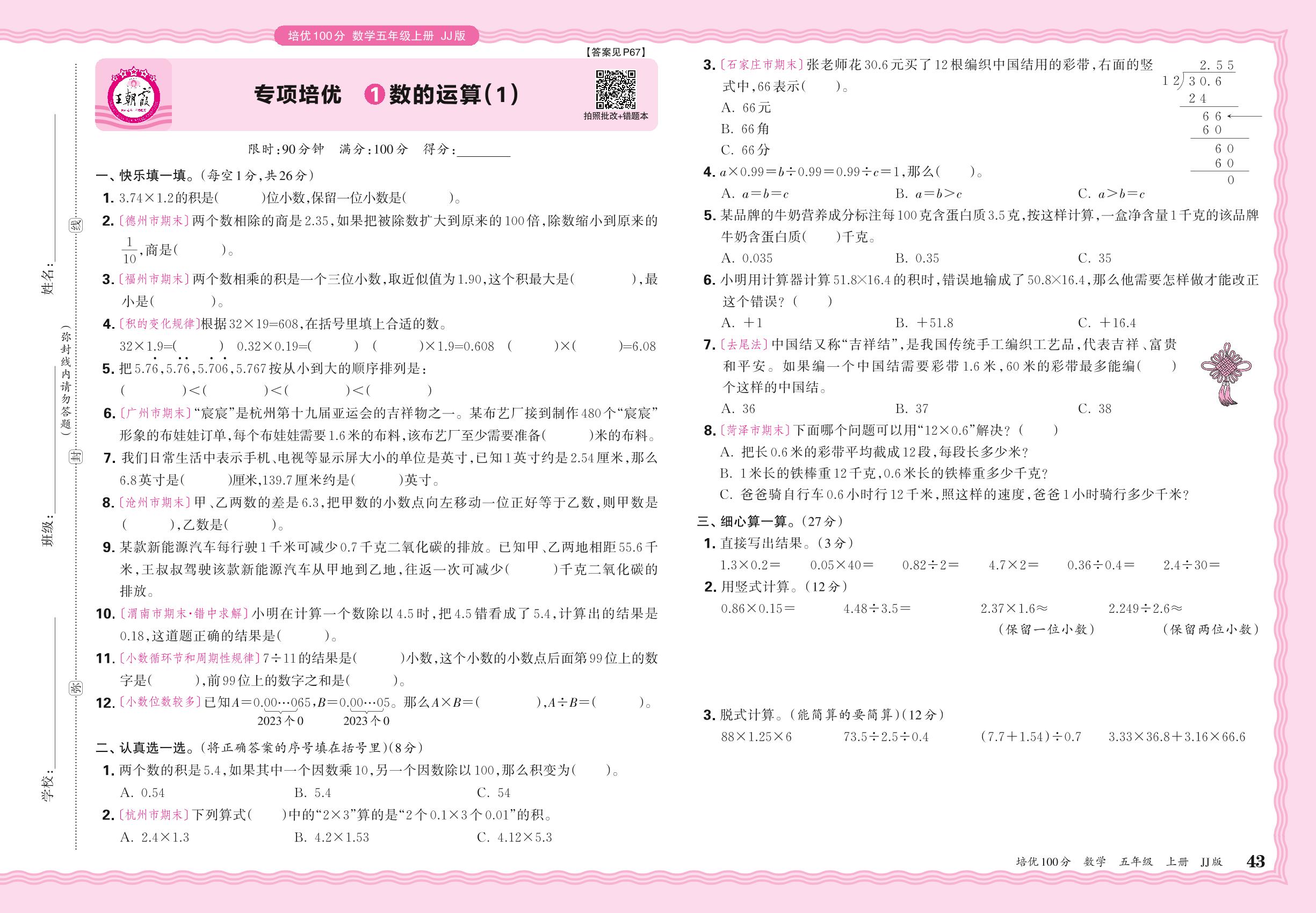 2024秋上册五年级数学冀教版 期末专项卷PY版·数的运算(1)