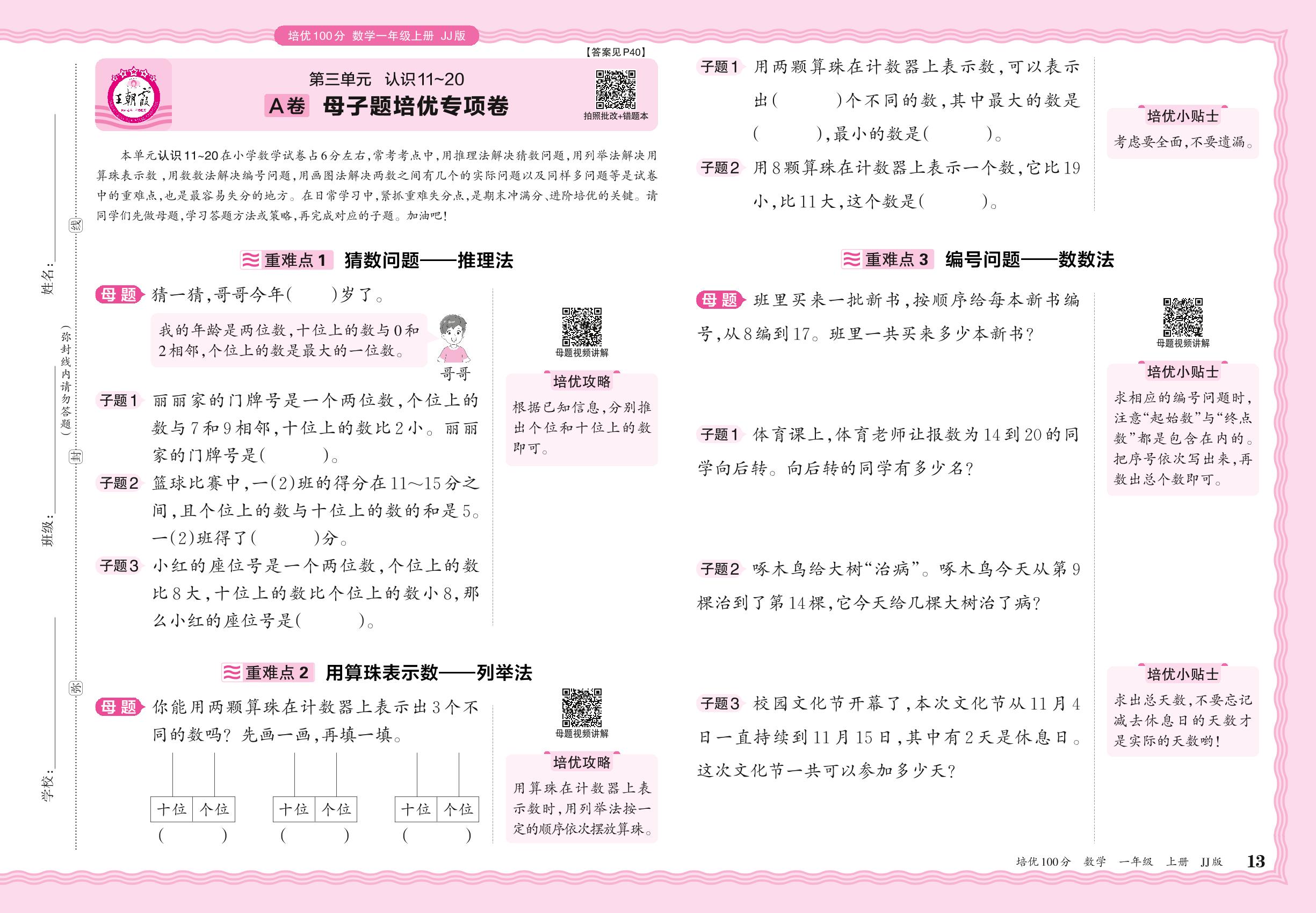2024秋上册一年级数学冀教版 第三单元A卷 母子題培优专项卷