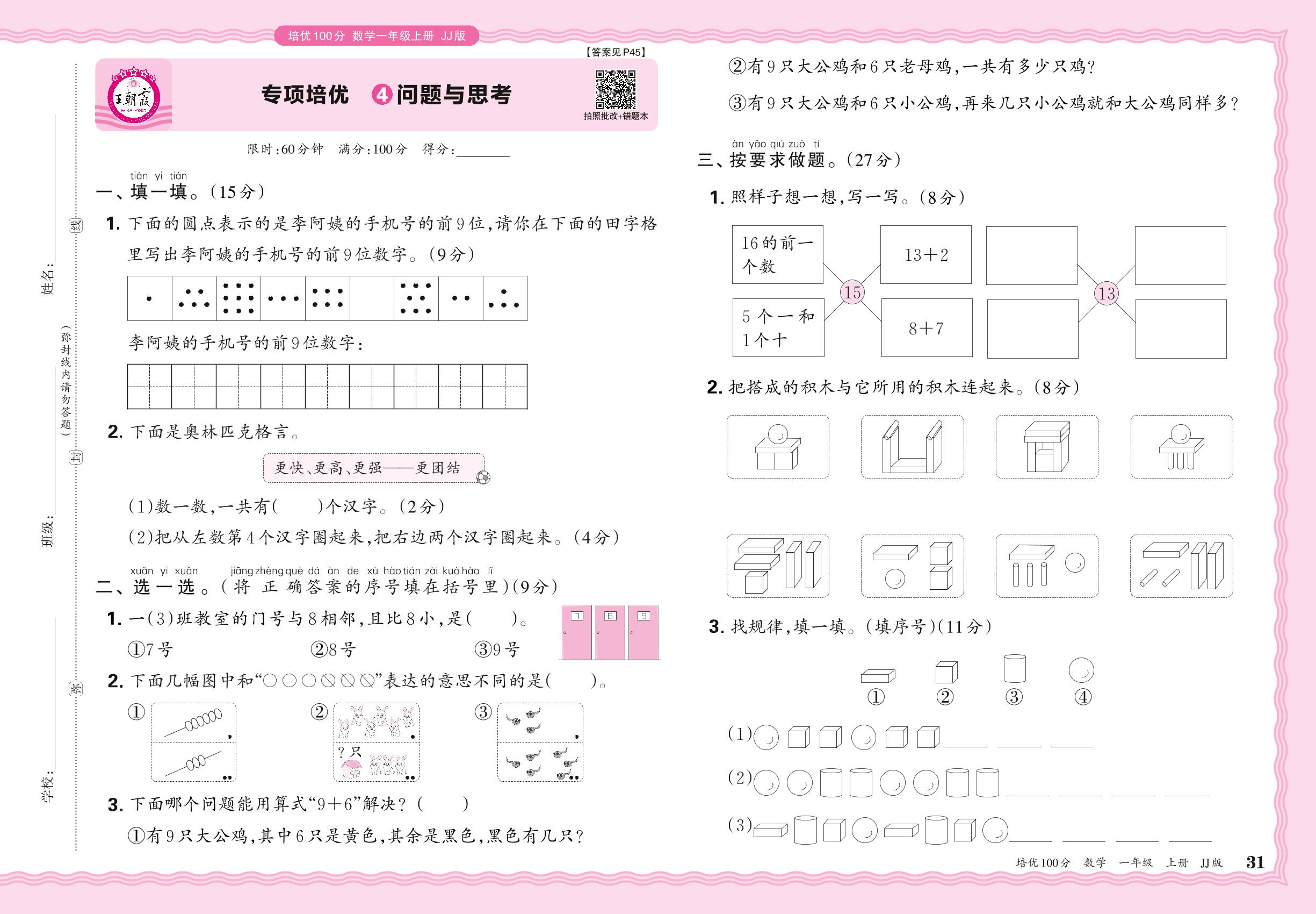 2024秋上册一年级数学冀教版 期末专项卷PY版·问题与思考【4】