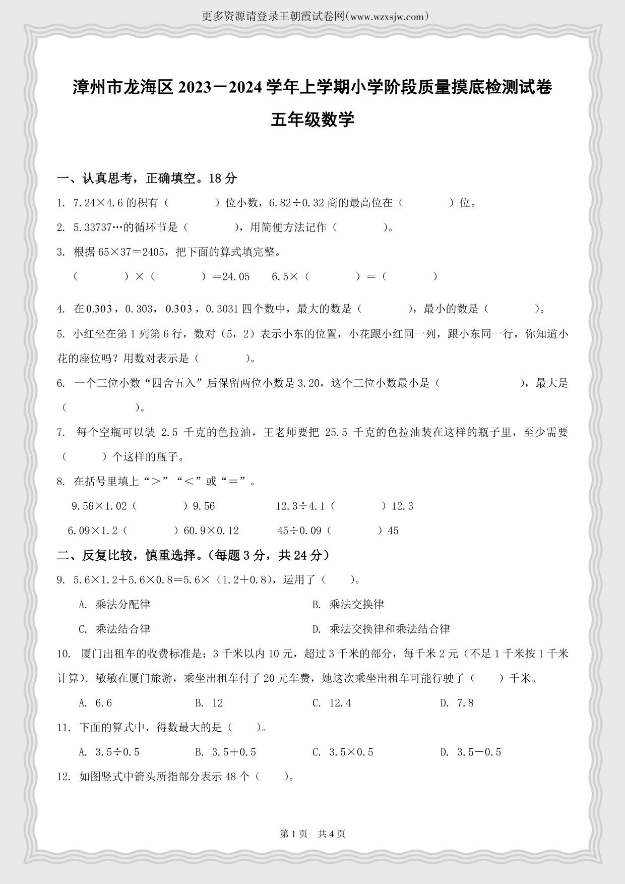 福建省漳州市龙海区2023-2024学年第一学期期中阶段质量摸底检测五年级数学(人教版)