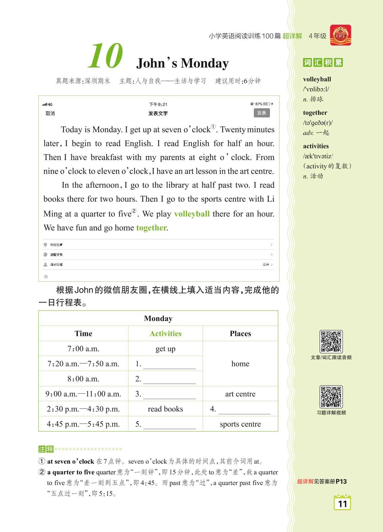 四年级英语阅读超详解 Part 1 青铜篇:10 John's Monday