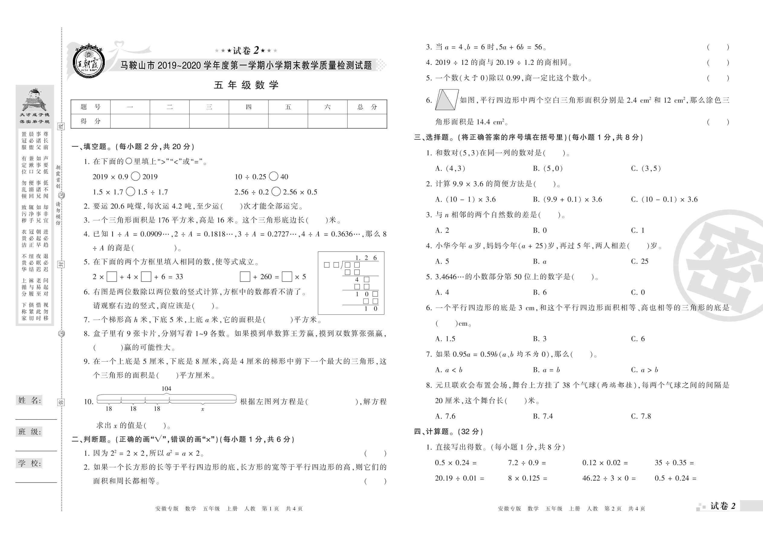 2019-2020学年第一学期马鞍山市五年级数学试卷(人教版)【2】