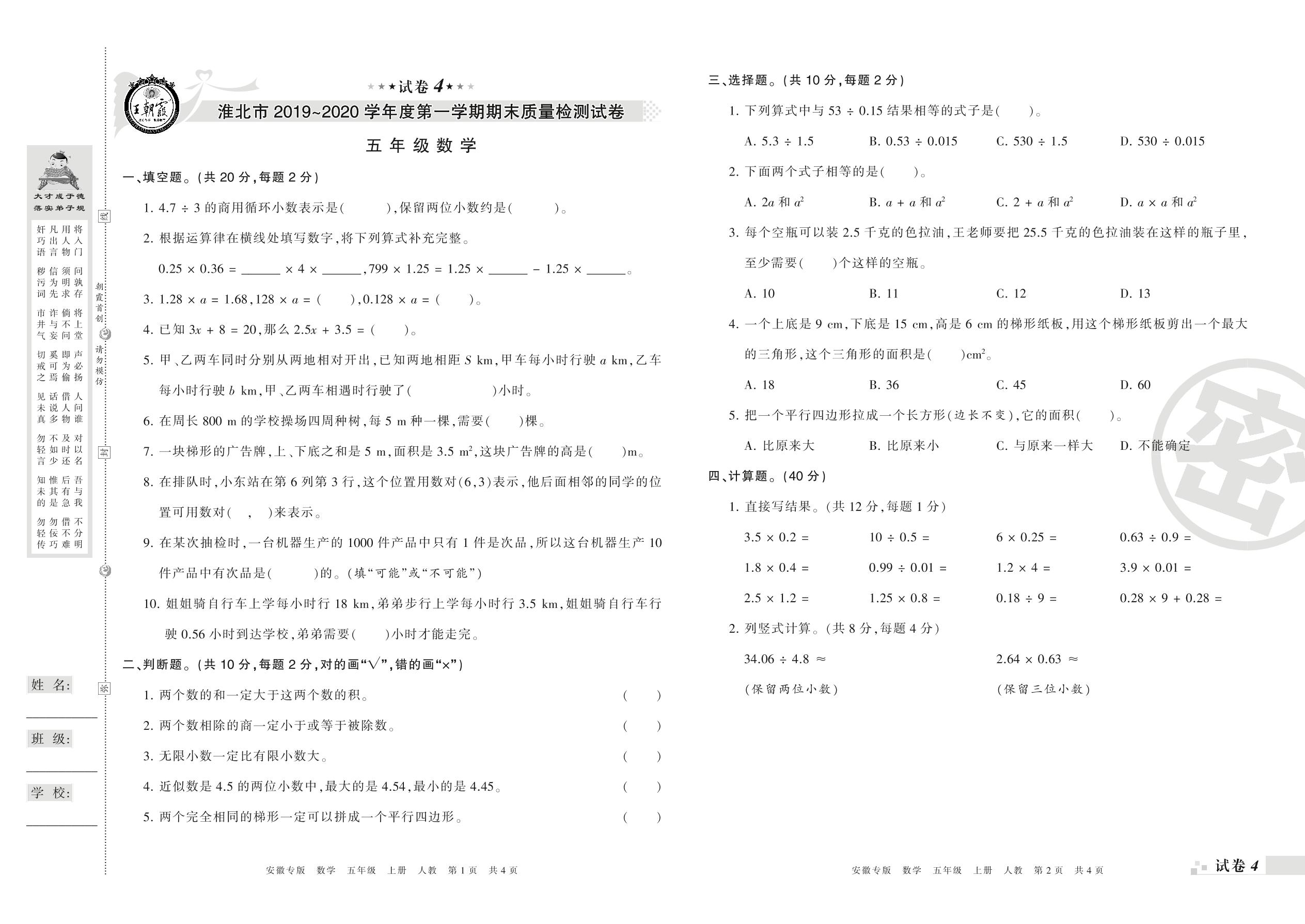 2019-2020学年第一学期淮北市五年级数学试卷(人教版)【4】