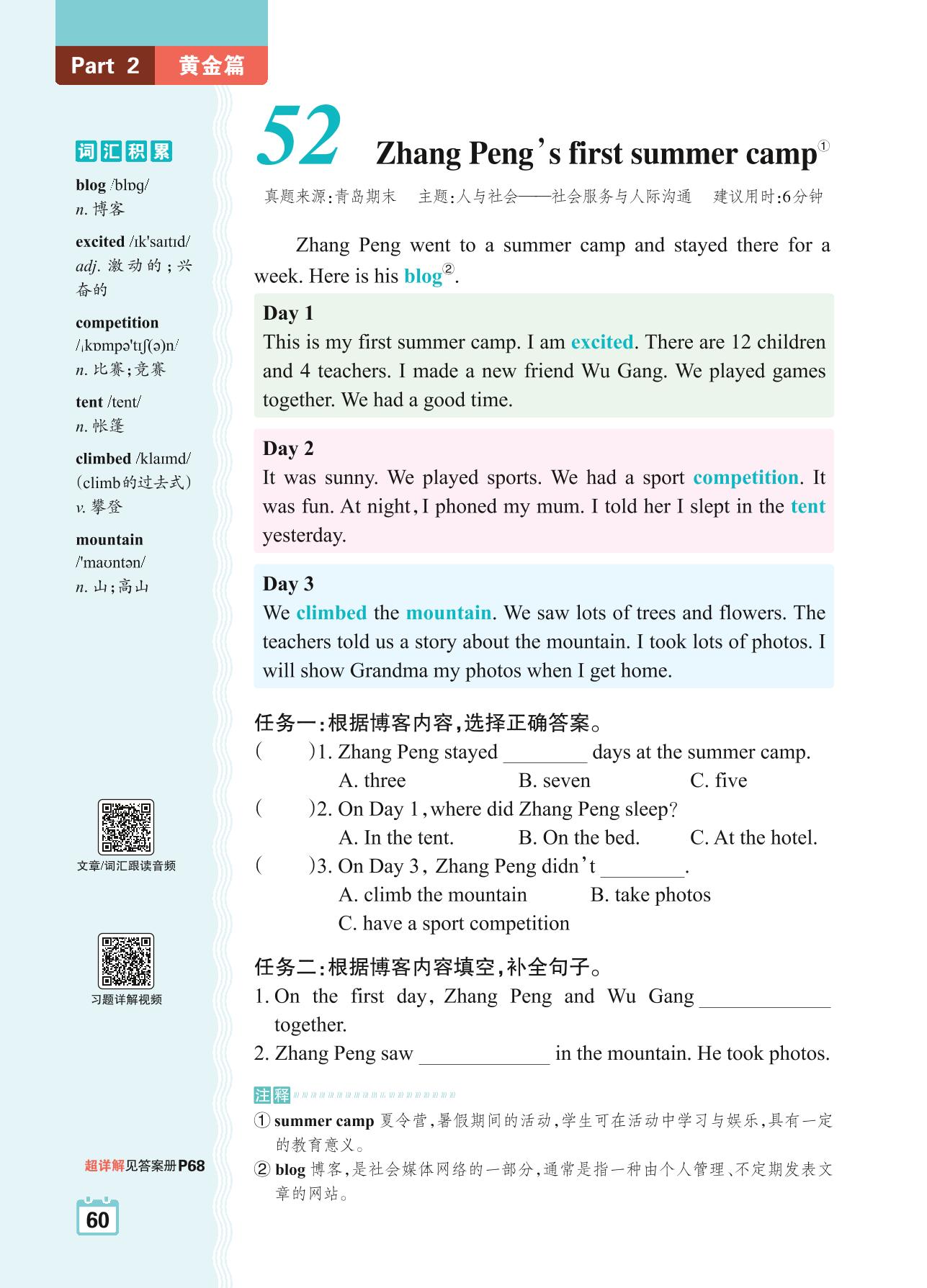 四年级英语阅读超详解 Part 2 黄金篇:52 Zhang Peng's first summer camp