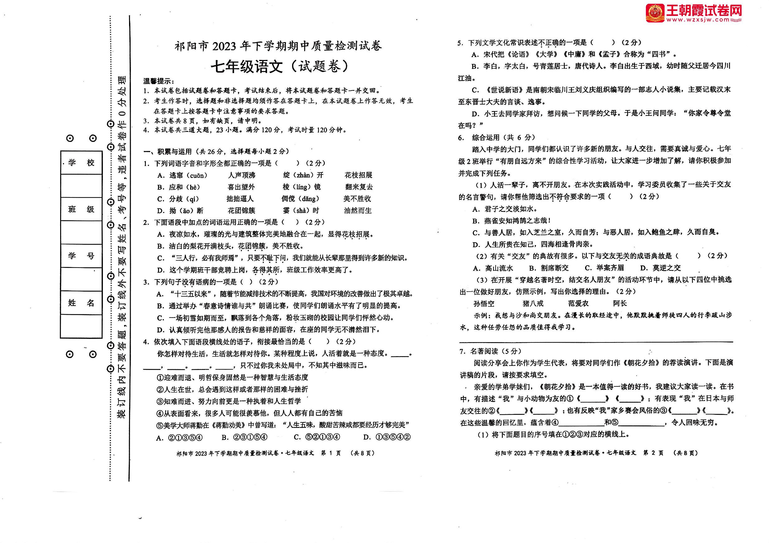 湖南省永州市祁阳市2023-2024学年第一学期期中质量检测试卷七年级语文(人教版)